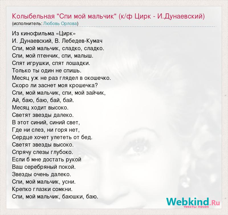 Из кинофильма «Цирк» И. Дунаевский, В. Лебедев-Кумач Спи, мой мальчик, сладко, сладко. Спи, мой птенчик, спи, малыш. Спят игрушки, спят лошадки. Только ты один не спишь. Месяц уж не раз глядел в окошечко. Скоро ли заснет моя крошечка? Спи, мой мальчик, спи, мой зайчик, Ай, баю, баю, бай, бай. Месяц ходит высоко. Светят звезды далеко. В этот синий, синий свет, Где ни слез, ни горя нет, Сердце хочет улететь от бед. Светят звезды высоко. Спрячу слезы глубоко. Если б мне достать рукой Ваш серебряный покой. Звезды очень далеко. Спи, мой мальчик, усни. Крепко глазки сомкни. Спи, мой мальчик, баюшки, баю.