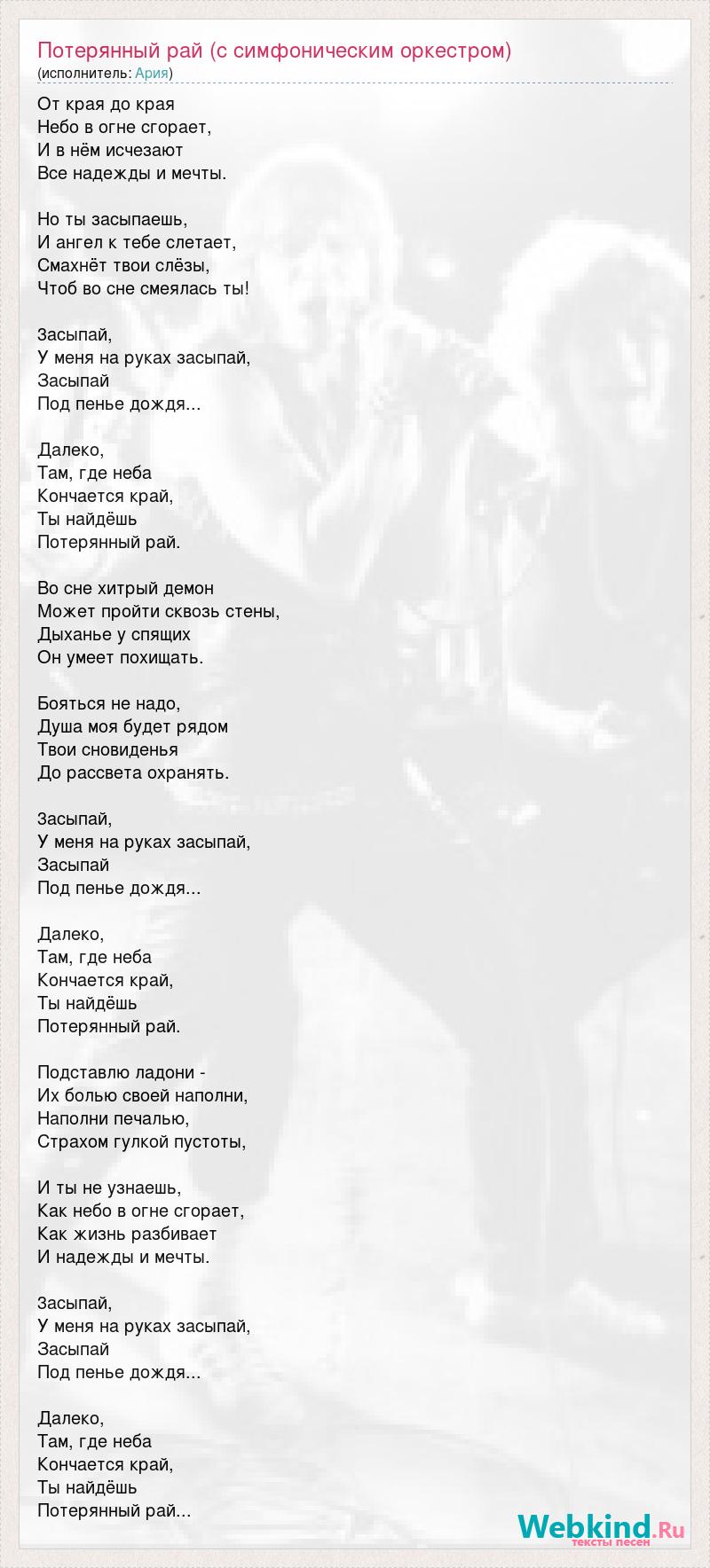 От края до края Небо в огне сгорает, И в нём исчезают Все надежды и мечты. Но ты засыпаешь, И ангел к тебе слетает, Смахнёт твои слёзы, Чтоб во сне смеялась ты! 3асыпай, У меня на руках засыпай, Засыпай Под пенье дождя... Далеко, Там, где неба Кончается край, Ты найдёшь Потерянный рай. Во сне хитрый демон Может пройти сквозь стены, Дыханье у спящих Он умеет похищать. Бояться не надо, Душа моя будет рядом Твои сновиденья До рассвета охранять. 3асыпай, У меня на руках засыпай, Засыпай Под пенье дождя... Далеко, Там, где неба Кончается край, Ты найдёшь Потерянный рай. Подставлю ладони - Их болью своей наполни, Наполни печалью, Страхом гулкой пустоты, И ты не узнаешь, Как небо в огне сгорает, Как жизнь разбивает И надежды и мечты. 3асыпай, У меня на руках засыпай, Засыпай Под пенье дождя... Далеко, Там, где неба Кончается край, Ты найдёшь Потерянный рай...