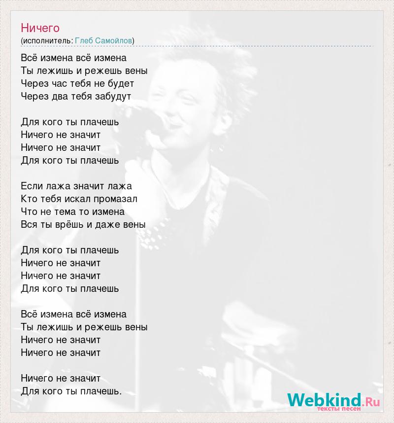 Всё измена всё измена Ты лежишь и режешь вены Через час тебя не будет Через два тебя забудут Для кого ты плачешь Ничего не значит Ничего не значит Для кого ты плачешь Если лажа значит лажа Кто тебя искал промазал Что не тема то измена Вся ты врёшь и даже вены Для кого ты плачешь Ничего не значит Ничего не значит Для кого ты плачешь Всё измена всё измена Ты лежишь и режешь вены Ничего не значит Ничего не значит Ничего не значит Для кого ты плачешь.