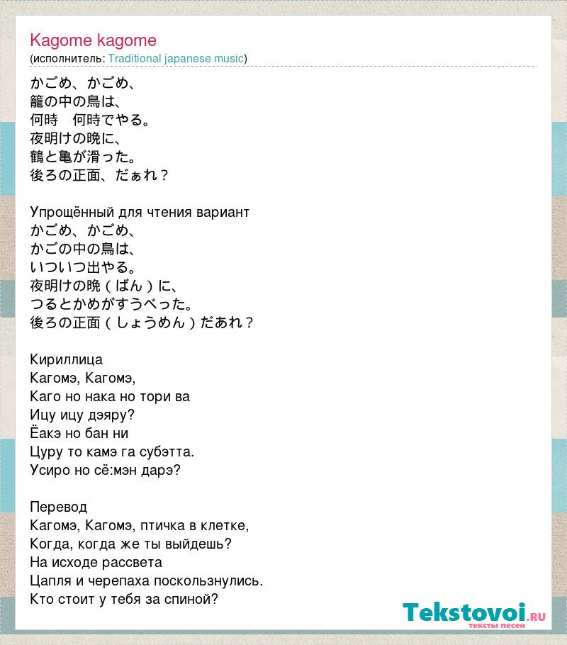 かごめ、かごめ、 籠の中の鳥は、 何時 何時でやる。 夜明けの晩に、 鶴と亀が滑った。 後ろの正面、だぁれ? Упрощённый для чтения вариант かごめ、かごめ、 かごの中の鳥は、 いついつ出やる。 夜明けの晩(ばん)に、 つるとかめがすうべった。 後ろの正面(しょうめん)だあれ? Кириллица Кагомэ, Кагомэ, Каго но нака но тори ва Ицу ицу дэяру? Ёакэ но бан ни Цуру то камэ га субэтта. Усиро но сё:мэн дарэ? Перевод Кагомэ, Кагомэ, птичка в клетке, Когда, когда же ты выйдешь? На исходе рассвета Цапля и черепаха поскользнулись. Кто стоит у тебя за спиной?