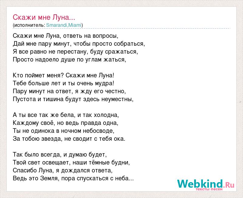 Скажи мне Луна, ответь на вопросы, Дай мне пару минут, чтобы просто собраться, Я все равно не перестану, буду сражаться, Просто надоело душе по углам жаться, Кто поймет меня? Скажи мне Луна! Тебе больше лет и ты очень мудра! Пару минут на ответ, я жду его честно, Пустота и тишина будут здесь неуместны, А ты все так же бела, и так холодна, Каждому своё, но ведь правда одна, Ты не одинока в ночном небосводе, За тобою звезда, не сводит с тебя ока. Так было всегда, и думаю будет, Твой свет освещает, наши тёмные будни, Спасибо Луна, я дождался ответа, Ведь это Земля, пора спускаться с неба...