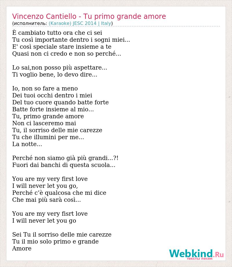 È cambiato tutto ora che ci sei Tu così importante dentro i sogni miei... E' così speciale stare insieme a te Quasi non ci credo e non so perché... Lo sai,non posso più aspettare... Ti voglio bene, lo devo dire... Io, non so fare a meno Dei tuoi occhi dentro i miei Del tuo cuore quando batte forte Batte forte insieme al mio... Tu, primo grande amore Non ci lasceremo mai Tu, il sorriso delle mie carezze Tu che illumini per me... La notte... Perché non siamo già più grandi...?! Fuori dai banchi di questa scuola... You are my very first love I will never let you go, Perché c’è qualcosa che mi dice Che mai più sarà così... You are my very fisrt love I will never let you go Sei Tu il sorriso delle mie carezze Tu il mio solo primo e grande Amore