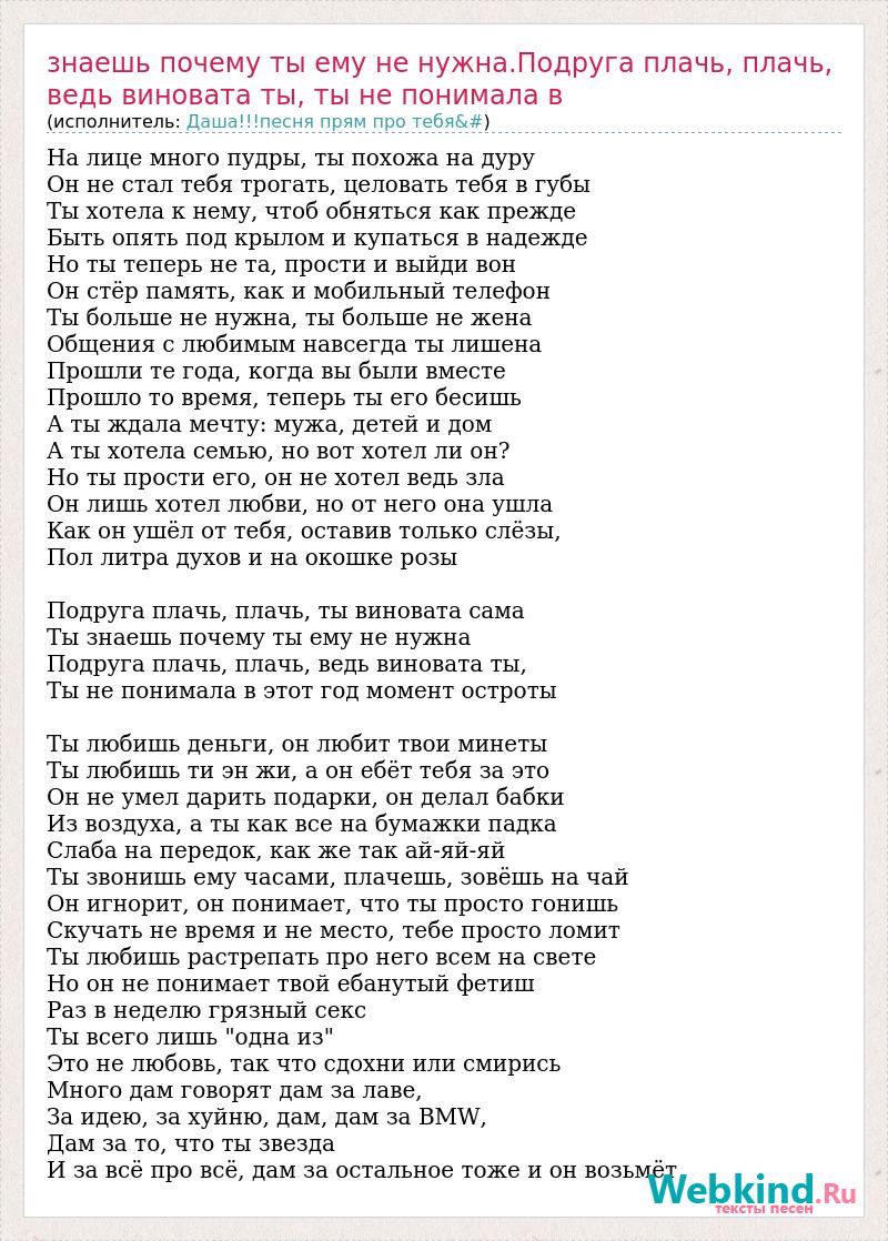 Знаешь почему ты ему не нужна.Подруга плачь, плачь, ведь виновата ты, ты не пони
