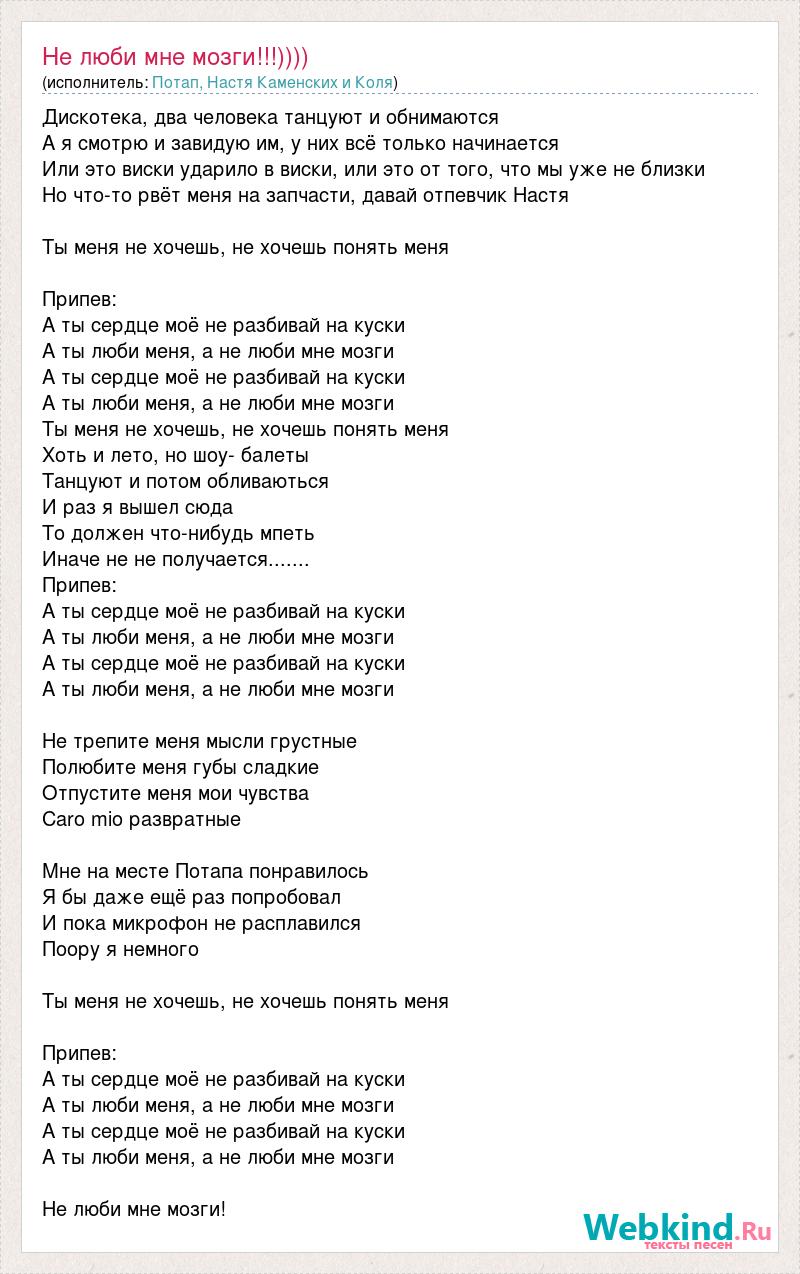 Дискотека, два человека танцуют и обнимаются А я смотрю и завидую им, у них всё только начинается Или это виски ударило в виски, или это от того, что мы уже не близки Но что-то рвёт меня на запчасти, давай отпевчик Настя Ты меня не хочешь, не хочешь понять меня Припев: А ты сердце моё не разбивай на куски А ты люби меня, а не люби мне мозги А ты сердце моё не разбивай на куски А ты люби меня, а не люби мне мозги Ты меня не хочешь, не хочешь понять меня Хоть и лето, но шоу- балеты Танцуют и потом обливаються И раз я вышел сюда То должен что-нибудь мпеть Иначе не не получается....... Припев: А ты сердце моё не разбивай на куски А ты люби меня, а не люби мне мозги А ты сердце моё не разбивай на куски А ты люби меня, а не люби мне мозги Не трепите меня мысли грустные Полюбите меня губы сладкие Отпустите меня мои чувства Caro mio развратные Мне на месте Потапа понравилось Я бы даже ещё раз попробовал И пока микрофон не расплавился Поору я немного Ты меня не хочешь, не хочешь понять меня Припев: А ты сердце моё не разбивай на куски А ты люби меня, а не люби мне мозги А ты сердце моё не разбивай на куски А ты люби меня, а не люби мне мозги Не люби мне мозги!