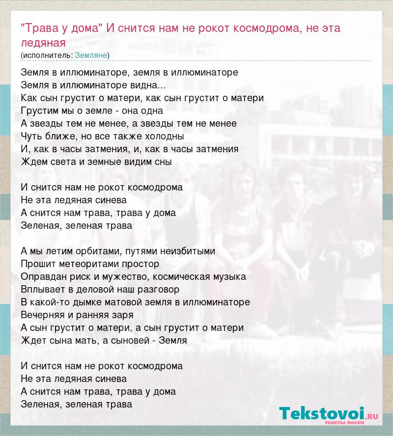 Главная→Исполнители→Земляне→"Трава у дома" И снится нам не рокот космодрома, не эта ледяная синева, а снится