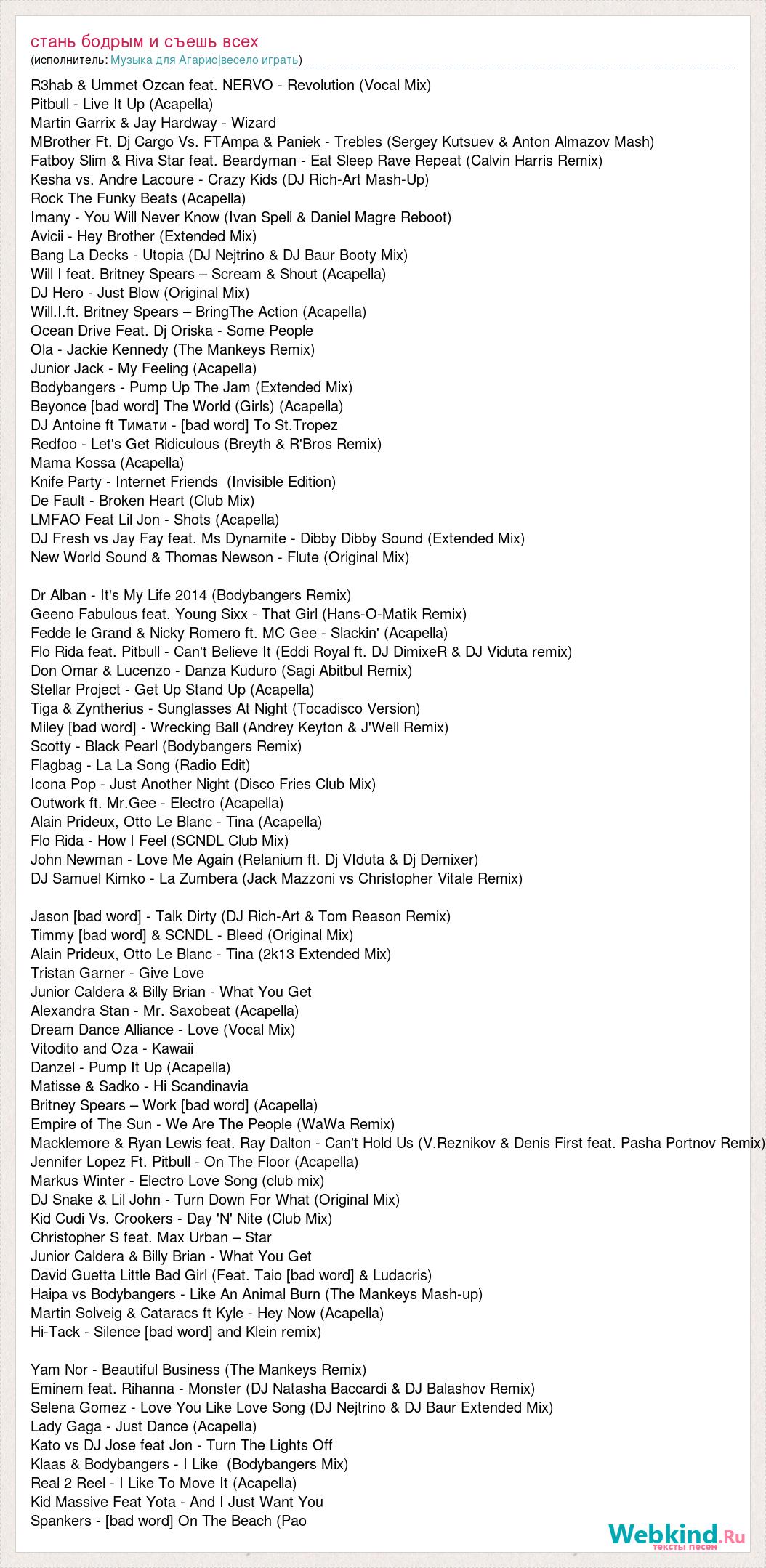 R3hab & Ummet Ozcan feat. NERVO - Revolution (Vocal Mix) Pitbull - Live It Up (Acapella) Martin Garrix & Jay Hardway - Wizard MBrother Ft. Dj Cargo Vs. FTAmpa & Paniek - Trebles (Sergey Kutsuev & Anton Almazov Mash) Fatboy Slim & Riva Star feat. Beardyman - Eat Sleep Rave Repeat (Calvin Harris Remix) Kesha vs. Andre Lacoure - Crazy Kids (DJ Rich-Art Mash-Up) Rock The Funky Beats (Acapella) Imany - You Will Never Know (Ivan Spell & Daniel Magre Reboot) Avicii - Hey Brother (Extended Mix) Bang La Decks - Utopia (DJ Nejtrino & DJ Baur Booty Mix) Will I feat. Britney Spears – Scream & Shout (Acapella) DJ Hero - Just Blow (Original Mix) Will.I.ft. Britney Spears – BringThe Action (Acapella) Ocean Drive Feat. Dj Oriska - Some People Ola - Jackie Kennedy (The Mankeys Remix) Junior Jack - My Feeling (Acapella) Bodybangers - Pump Up The Jam (Extended Mix) Beyonce [bad word] The World (Girls) (Acapella) DJ Antoine ft Тимати - [bad word] To St.Tropez Redfoo - Let's Get Ridiculous (Breyth & R'Bros Remix) Mama Kossa (Acapella) Knife Party - Internet Friends (Invisible Edition) De Fault - Broken Heart (Club Mix) LMFAO Feat Lil Jon - Shots (Acapella) DJ Fresh vs Jay Fay feat. Ms Dynamite - Dibby Dibby Sound (Extended Mix) New World Sound & Thomas Newson - Flute (Original Mix) Dr Alban - It's My Life 2014 (Bodybangers Remix) Geeno Fabulous feat. Young Sixx - That Girl (Hans-O-Matik Remix) Fedde le Grand & Nicky Romero ft. MC Gee - Slackin' (Acapella) Flo Rida feat. Pitbull - Can't Believe It (Eddi Royal ft. DJ DimixeR & DJ Viduta remix) Don Omar & Lucenzo - Danza Kuduro (Sagi Abitbul Remix) Stellar Project - Get Up Stand Up (Acapella) Tiga & Zyntherius - Sunglasses At Night (Tocadisco Version) Miley [bad word] - Wrecking Ball (Andrey Keyton & J'Well Remix) Scotty - Black Pearl (Bodybangers Remix) Flagbag - La La Song (Radio Edit) Icona Pop - Just Another Night (Disco Fries Club Mix) Outwork ft. Mr.Gee - Electro (Acapella) Alain Prideux, Otto Le Blanc - Tina (Acapella) Flo Rida - How I Feel (SCNDL Club Mix) John Newman - Love Me Again (Relanium ft. Dj VIduta & Dj Demixer) DJ Samuel Kimko - La Zumbera (Jack Mazzoni vs Christopher Vitale Remix) Jason [bad word] - Talk Dirty (DJ Rich-Art & Tom Reason Remix) Timmy [bad word] & SCNDL - Bleed (Original Mix) Alain Prideux, Otto Le Blanc - Tina (2k13 Extended Mix) Tristan Garner - Give Love Junior Caldera & Billy Brian - What You Get Alexandra Stan - Mr. Saxobeat (Acapella) Dream Dance Alliance - Love (Vocal Mix) Vitodito and Oza - Kawaii Danzel - Pump It Up (Acapella) Matisse & Sadko - Hi Scandinavia Britney Spears – Work [bad word] (Acapella) Empire of The Sun - We Are The People (WaWa Remix) Macklemore & Ryan Lewis feat. Ray Dalton - Can't Hold Us (V.Reznikov & Denis First feat. Pasha Portnov Remix) Jennifer Lopez Ft. Pitbull - On The Floor (Acapella) Markus Winter - Electro Love Song (club mix) DJ Snake & Lil John - Turn Down For What (Original Mix) Kid Cudi Vs. Crookers - Day 'N' Nite (Club Mix) Christopher S feat. Max Urban – Star Junior Caldera & Billy Brian - What You Get David Guetta Little Bad Girl (Feat. Taio [bad word] & Ludacris) Haipa vs Bodybangers - Like An Animal Burn (The Mankeys Mash-up) Martin Solveig & Cataracs ft Kyle - Hey Now (Acapella) Hi-Tack - Silence [bad word] and Klein remix) Yam Nor - Beautiful Business (The Mankeys Remix) Eminem feat. Rihanna - Monster (DJ Natasha Baccardi & DJ Balashov Remix) Selena Gomez - Love You Like Love Song (DJ Nejtrino & DJ Baur Extended Mix) Lady Gaga - Just Dance (Acapella) Kato vs DJ Jose feat Jon - Turn The Lights Off Klaas & Bodybangers - I Like (Bodybangers Mix) Real 2 Reel - I Like To Move It (Acapella) Kid Massive Feat Yota - And I Just Want You Spankers - [bad word] On The Beach (Pao
