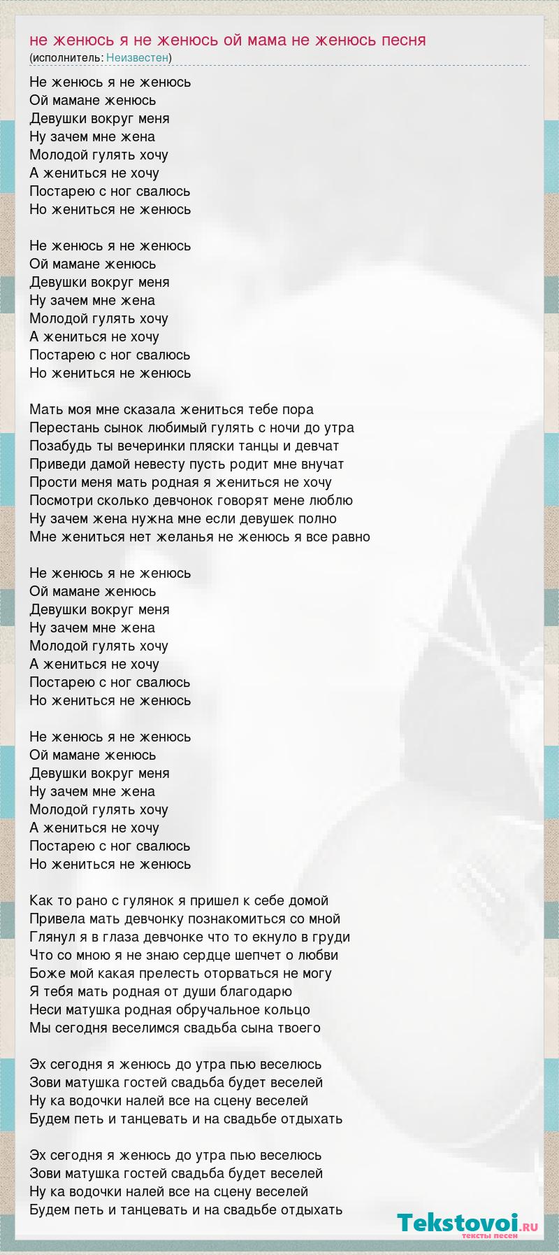 Не женюсь я не женюсь Ой мамане женюсь Девушки вокруг меня Ну зачем мне жена Молодой гулять хочу А жениться не хочу Постарею с ног свалюсь Но жениться не женюсь Не женюсь я не женюсь Ой мамане женюсь Девушки вокруг меня Ну зачем мне жена Молодой гулять хочу А жениться не хочу Постарею с ног свалюсь Но жениться не женюсь Мать моя мне сказала жениться тебе пора Перестань сынок любимый гулять с ночи до утра Позабудь ты вечеринки пляски танцы и девчат Приведи дамой невесту пусть родит мне внучат Прости меня мать родная я жениться не хочу Посмотри сколько девчонок говорят мене люблю Ну зачем жена нужна мне если девушек полно Мне жениться нет желанья не женюсь я все равно Не женюсь я не женюсь Ой мамане женюсь Девушки вокруг меня Ну зачем мне жена Молодой гулять хочу А жениться не хочу Постарею с ног свалюсь Но жениться не женюсь Не женюсь я не женюсь Ой мамане женюсь Девушки вокруг меня Ну зачем мне жена Молодой гулять хочу А жениться не хочу Постарею с ног свалюсь Но жениться не женюсь Как то рано с гулянок я пришел к себе домой Привела мать девчонку познакомиться со мной Глянул я в глаза девчонке что то екнуло в груди Что со мною я не знаю сердце шепчет о любви Боже мой какая прелесть оторваться не могу Я тебя мать родная от души благодарю Неси матушка родная обручальное кольцо Мы сегодня веселимся свадьба сына твоего Эх сегодня я женюсь до утра пью веселюсь Зови матушка гостей свадьба будет веселей Ну ка водочки налей все на сцену веселей Будем петь и танцевать и на свадьбе отдыхать Эх сегодня я женюсь до утра пью веселюсь Зови матушка гостей свадьба будет веселей Ну ка водочки налей все на сцену веселей Будем петь и танцевать и на свадьбе отдыхать