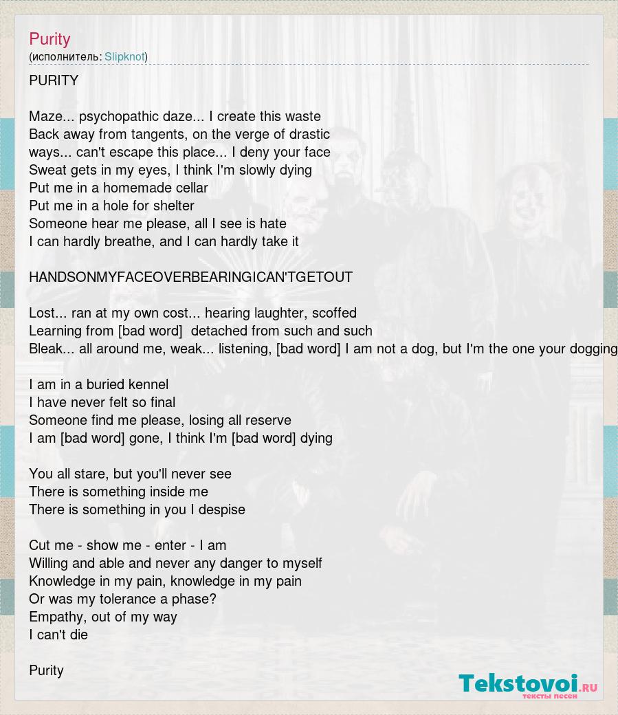 PURITY Maze... psychopathic daze... I create this waste Back away from tangents, on the verge of drastic ways... can't escape this place... I deny your face Sweat gets in my eyes, I think I'm slowly dying Put me in a homemade cellar Put me in a hole for shelter Someone hear me please, all I see is hate I can hardly breathe, and I can hardly take it HANDSONMYFACEOVERBEARINGICAN'TGETOUT Lost... ran at my own cost... hearing laughter, scoffed Learning from the rush, detached from such and such Bleak... all around me, weak... listening, incomplete I am not a dog, but I'm the one your dogging I am in a buried kennel I have never felt so final Someone find me please, losing all reserve I am [bad word] gone, I think I'm [bad word] dying You all stare, but you'll never see There is something inside me There is something in you I despise Cut me - show me - enter - I am Willing and able and never any danger to myself Knowledge in my pain, knowledge in my pain Or was my tolerance a phase? Empathy, out of my way I can't die Purity