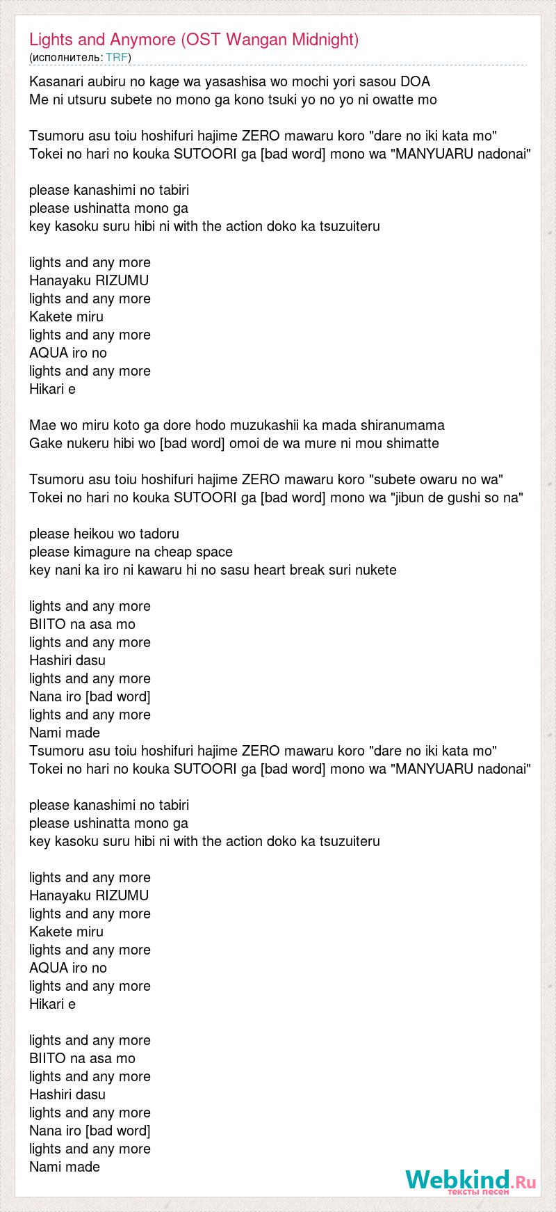 Kasanari aubiru no kage wa yasashisa wo mochi yori sasou DOA Me ni utsuru subete no mono ga kono tsuki yo no yo ni owatte mo Tsumoru asu toiu hoshifuri hajime ZERO mawaru koro "dare no iki kata mo" Tokei no hari no kouka SUTOORI ga [bad word] mono wa "MANYUARU nadonai" please kanashimi no tabiri please ushinatta mono ga key kasoku suru hibi ni with the action doko ka tsuzuiteru lights and any more Hanayaku RIZUMU lights and any more Kakete miru lights and any more AQUA iro no lights and any more Hikari e Mae wo miru koto ga dore hodo muzukashii ka mada shiranumama Gake nukeru hibi wo [bad word] omoi de wa mure ni mou shimatte Tsumoru asu toiu hoshifuri hajime ZERO mawaru koro "subete owaru no wa" Tokei no hari no kouka SUTOORI ga [bad word] mono wa "jibun de gushi so na" please heikou wo tadoru please kimagure na cheap space key nani ka iro ni kawaru hi no sasu heart break suri nukete lights and any more BIITO na asa mo lights and any more Hashiri dasu lights and any more Nana iro [bad word] lights and any more Nami made Tsumoru asu toiu hoshifuri hajime ZERO mawaru koro "dare no iki kata mo" Tokei no hari no kouka SUTOORI ga [bad word] mono wa "MANYUARU nadonai" please kanashimi no tabiri please ushinatta mono ga key kasoku suru hibi ni with the action doko ka tsuzuiteru lights and any more Hanayaku RIZUMU lights and any more Kakete miru lights and any more AQUA iro no lights and any more Hikari e lights and any more BIITO na asa mo lights and any more Hashiri dasu lights and any more Nana iro [bad word] lights and any more Nami made