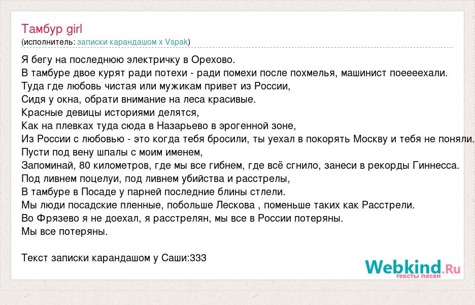 Я бегу на последнюю электричку в Орехово. В тамбуре двое курят ради потехи - ради помехи после похмелья, машинист поеееехали. Туда где любовь чистая или мужикам привет из России, Сидя у окна, обрати внимание на леса красивые. Красные девицы историями делятся, Как на плевках туда сюда в Назарьево в эрогенной зоне, Из России с любовью - это когда тебя бросили, ты уехал в покорять Москву и тебя не поняли. Пусти под вену шпалы с моим именем, Запоминай, 80 километров, где мы все гибнем, где всё сгнило, занеси в рекорды Гиннесса. Под ливнем поцелуи, под ливнем убийства и расстрелы, В тамбуре в Посаде у парней последние блины стлели. Мы люди посадские пленные, побольше Лескова , поменьше таких как Расстрели. Во Фрязево я не доехал, я расстрелян, мы все в России потеряны. Мы все потеряны. Текст записки карандашом у Саши:333