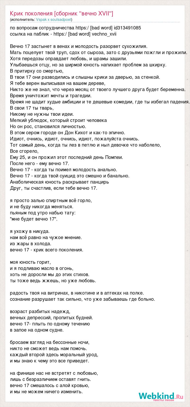 по вопросам сотрудничества https:/ [bad word] id313491085 ссылка на паблик - https:/ [bad word] vechno_xvii Вечно 17 застынет в венах и молодость разорвет сухожилия. Мать поцелует твой труп, сдох от сыроза, зато с друзьями пожгли и прожили. Хотя передозы оправдает любовь, и шрамы зашили. Улыбаешься отцу, но за ширмой юность напихает проблем за шкирку. В притирку со смертью, В твои 17 они разводились и слышны крики за дверью, за стенкой. Я тебе верен выписывая на вашем дереве, Никто же не знал, что через месяц от твоего лучшего друга будет беременна. Время уничтожит мечты и трагедии. Время не щадит худые амбиции и те дешевые комедии, где ты избегал падения. В свои 17 ты тварь, Никому не нужны твои идеи. Мелкий ублюдок, который строит человека Но он рос, становился личностью. В этом сером городе он Дон Кихот и как-то эпично. Идиот, очнись, идиот, очнись, идиот, пожалуйста очнись. Тот самый день, когда ты лез в петлю и ныл девочке что наболело, Все сгорело, Ему 25, и он прожил этот последний день Помпеи. После него - ему вечно 17. Вечно 17 - когда ты поимел молодость анально. Вечно 17 - когда твой суицид это смешно и банально. Анаболическая юность раскрывает панцирь Друг, ты счастлив, если тебе вечно 17. я просто залью спиртным всё горло, и не буду никогда меняться. пьяным под утро набью тату: "мне будет вечно 17". я ухожу в никуда. нам всё равно на чужое мнение. из жары в холода. вечно 17 - крик всего поколения. моя юность горит, и я подливаю масло в огонь, хоть не доросли мы до этих стихов. ты тоже ведь жжешь, но уже любовь. радость твоя на витринах, в никотине и в аптеках на полке. сознание разрушает так сильно, что уже забываешь где больно. возраст разбитых надежд, вечных депрессий, пропитых будней. вечно 17- плыть по одному течению в запое на одном судне. бросаем взгляд на бессонные ночи, никто не сможет ведь нам помочь. каждый второй здесь моральный урод, и мы знаю к чему это все приведет. на финише нас не встретят с любовью, лишь с безразличием оставят гнить. вечно 17 смешалось с алой кровью, и мы не можем ничего изменить.