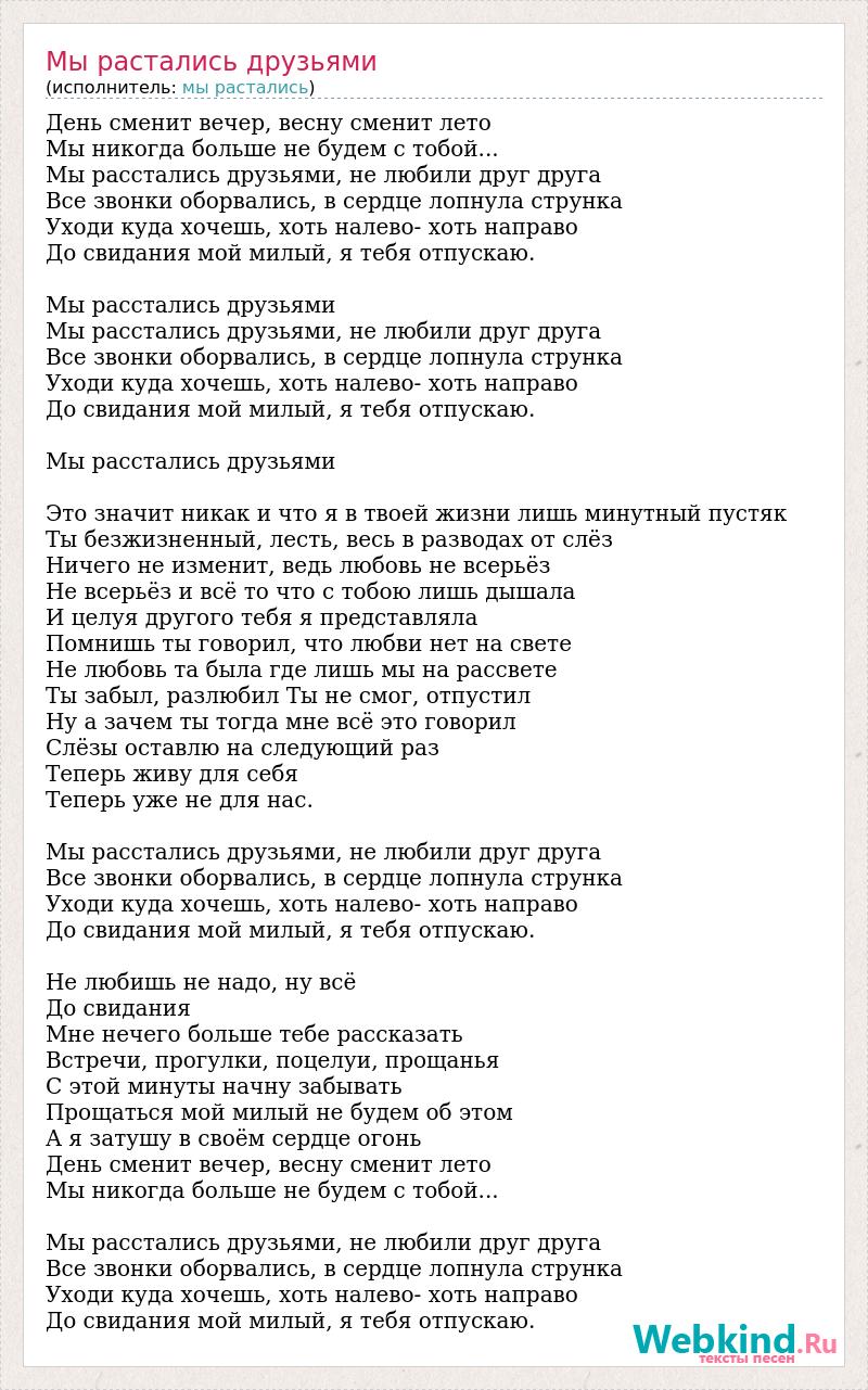 День сменит вечер, весну сменит лето Мы никогда больше не будем с тобой... Мы расстались друзьями, не любили друг друга Все звонки оборвались, в сердце лопнула струнка Уходи куда хочешь, хоть налево- хоть направо До свидания мой милый, я тебя отпускаю. Мы расстались друзьями Мы расстались друзьями, не любили друг друга Все звонки оборвались, в сердце лопнула струнка Уходи куда хочешь, хоть налево- хоть направо До свидания мой милый, я тебя отпускаю. Мы расстались друзьями Это значит никак и что я в твоей жизни лишь минутный пустяк Ты безжизненный, лесть, весь в разводах от слёз Ничего не изменит, ведь любовь не всерьёз Не всерьёз и всё то что с тобою лишь дышала И целуя другого тебя я представляла Помнишь ты говорил, что любви нет на свете Не любовь та была где лишь мы на рассвете Ты забыл, разлюбил Ты не смог, отпустил Ну а зачем ты тогда мне всё это говорил Слёзы оставлю на следующий раз Теперь живу для себя Теперь уже не для нас. Мы расстались друзьями, не любили друг друга Все звонки оборвались, в сердце лопнула струнка Уходи куда хочешь, хоть налево- хоть направо До свидания мой милый, я тебя отпускаю. Не любишь не надо, ну всё До свидания Мне нечего больше тебе рассказать Встречи, прогулки, поцелуи, прощанья С этой минуты начну забывать Прощаться мой милый не будем об этом А я затушу в своём сердце огонь День сменит вечер, весну сменит лето Мы никогда больше не будем с тобой... Мы расстались друзьями, не любили друг друга Все звонки оборвались, в сердце лопнула струнка Уходи куда хочешь, хоть налево- хоть направо До свидания мой милый, я тебя отпускаю.
