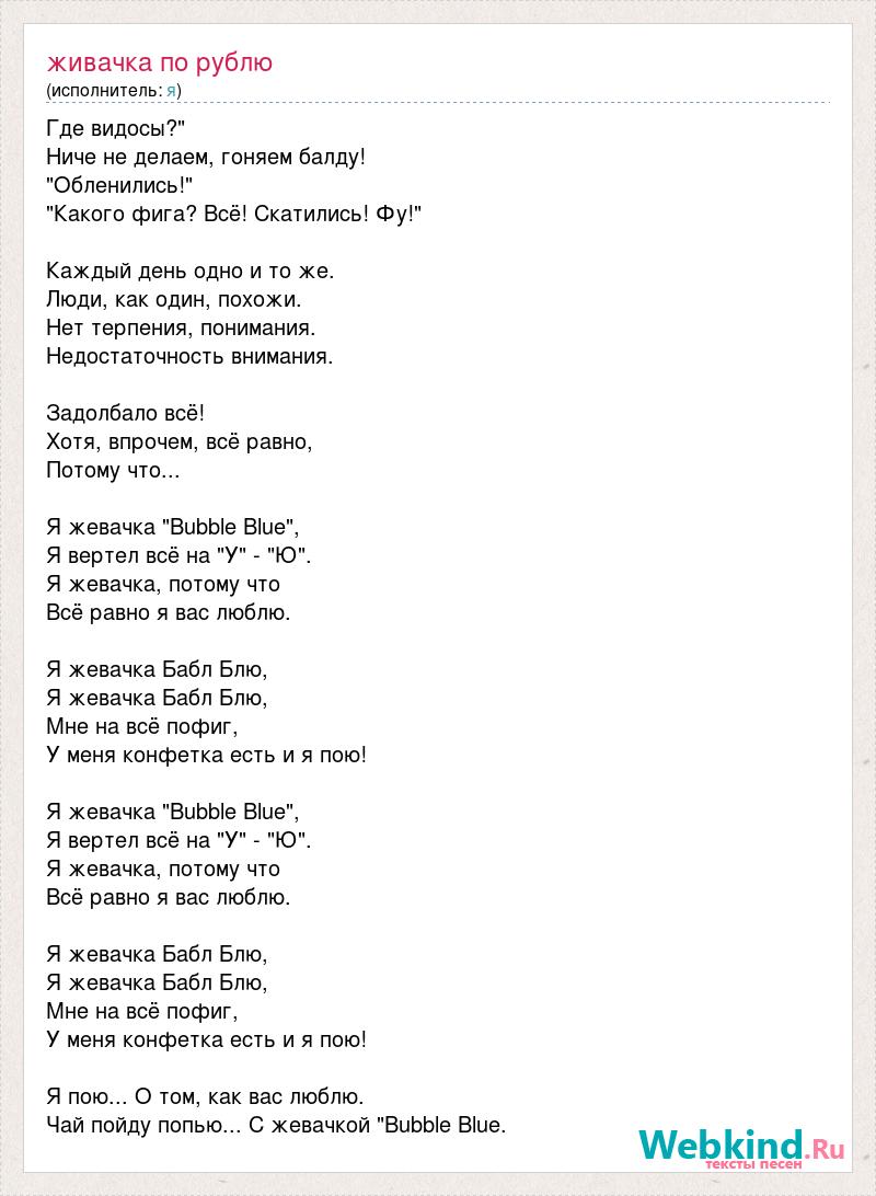 Где видосы?" Ниче не делаем, гоняем балду! "Обленились!" "Какого фига? Всё! Скатились! Фу!" Каждый день одно и то же. Люди, как один, похожи. Нет терпения, понимания. Недостаточность внимания. Задолбало всё! Хотя, впрочем, всё равно, Потому что... Я жевачка "Bubble Blue", Я вертел всё на "У" - "Ю". Я жевачка, потому что Всё равно я вас люблю. Я жевачка Бабл Блю, Я жевачка Бабл Блю, Мне на всё пофиг, У меня конфетка есть и я пою! Я жевачка "Bubble Blue", Я вертел всё на "У" - "Ю". Я жевачка, потому что Всё равно я вас люблю. Я жевачка Бабл Блю, Я жевачка Бабл Блю, Мне на всё пофиг, У меня конфетка есть и я пою! Я пою... О том, как вас люблю. Чай пойду попью... С жевачкой "Bubble Blue.