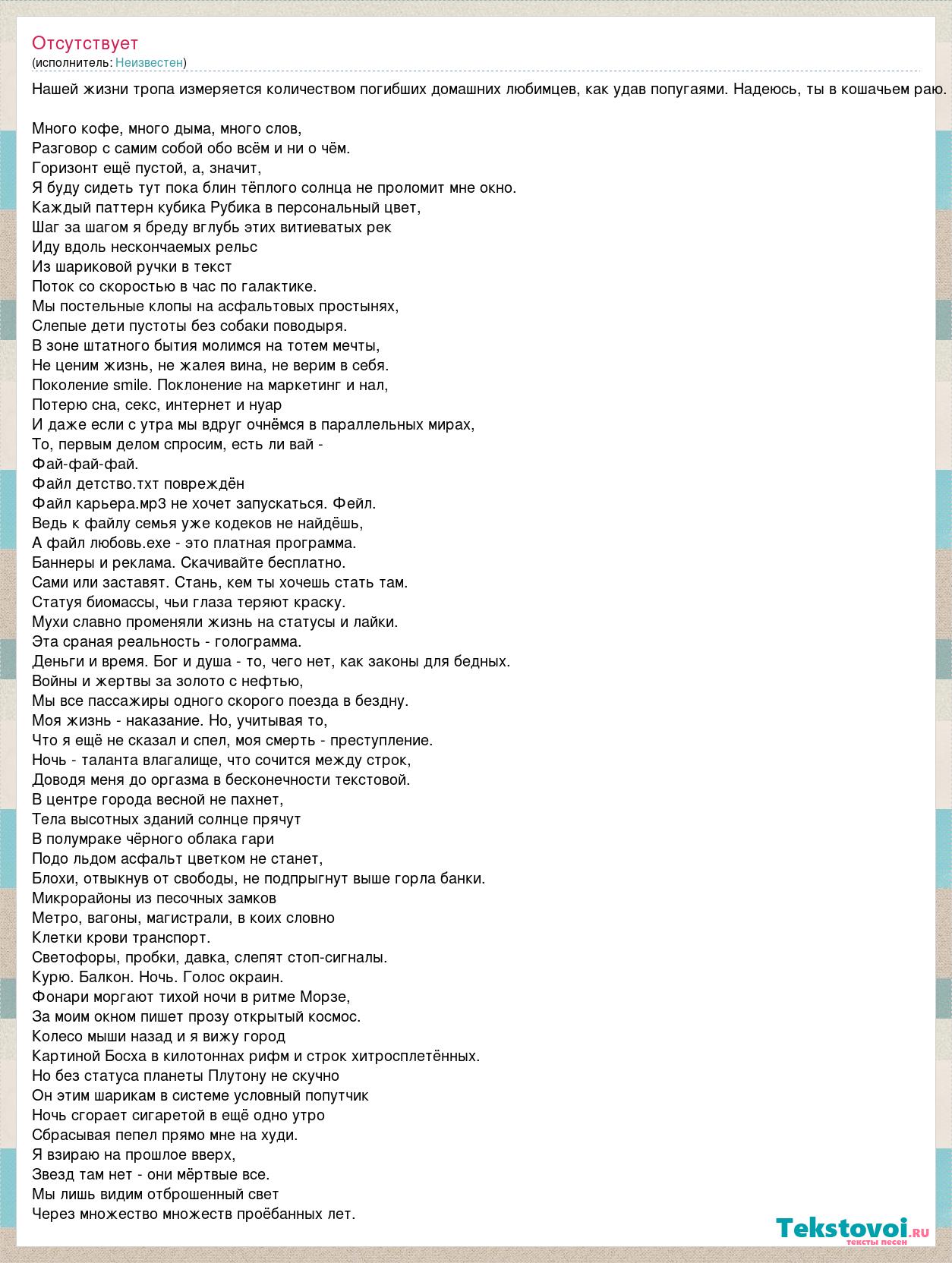 Нашей жизни тропа измеряется количеством погибших домашних любимцев, как удав попугаями. Надеюсь, ты в кошачьем раю. Много кофе, много дыма, много слов, Разговор с самим собой обо всём и ни о чём. Горизонт ещё пустой, а, значит, Я буду сидеть тут пока блин тёплого солнца не проломит мне окно. Каждый паттерн кубика Рубика в персональный цвет, Шаг за шагом я бреду вглубь этих витиеватых рек Иду вдоль нескончаемых рельс Из шариковой ручки в текст Поток со скоростью в час по галактике. Мы постельные клопы на асфальтовых простынях, Слепые дети пустоты без собаки поводыря. В зоне штатного бытия молимся на тотем мечты, Не ценим жизнь, не жалея вина, не верим в себя. Поколение smile. Поклонение на маркетинг и нал, Потерю сна, секс, интернет и нуар И даже если с утра мы вдруг очнёмся в параллельных мирах, То, первым делом спросим, есть ли вай - Фай-фай-фай. Файл детство.тхт повреждён Файл карьера.мр3 не хочет запускаться. Фейл. Ведь к файлу семья уже кодеков не найдёшь, А файл любовь.ехе - это платная программа. Баннеры и реклама. Скачивайте бесплатно. Сами или заставят. Стань, кем ты хочешь стать там. Статуя биомассы, чьи глаза теряют краску. Мухи славно променяли жизнь на статусы и лайки. Эта сраная реальность - голограмма. Деньги и время. Бог и душа - то, чего нет, как законы для бедных. Войны и жертвы за золото с нефтью, Мы все пассажиры одного скорого поезда в бездну. Моя жизнь - наказание. Но, учитывая то, Что я ещё не сказал и спел, моя смерть - преступление. Ночь - таланта влагалище, что сочится между строк, Доводя меня до оргазма в бесконечности текстовой. В центре города весной не пахнет, Тела высотных зданий солнце прячут В полумраке чёрного облака гари Подо льдом асфальт цветком не станет, Блохи, отвыкнув от свободы, не подпрыгнут выше горла банки. Микрорайоны из песочных замков Метро, вагоны, магистрали, в коих словно Клетки крови транспорт. Светофоры, пробки, давка, слепят стоп-сигналы. Курю. Балкон. Ночь. Голос окраин. Фонари моргают тихой ночи в ритме Морзе, За моим окном пишет прозу открытый космос. Колесо мыши назад и я вижу город Картиной Босха в килотоннах рифм и строк хитросплетённых. Но без статуса планеты Плутону не скучно Он этим шарикам в системе условный попутчик Ночь сгорает сигаретой в ещё одно утро Сбрасывая пепел прямо мне на худи. Я взираю на прошлое вверх, Звезд там нет - они мёртвые все. Мы лишь видим отброшенный свет Через множество множеств проёбанных лет.