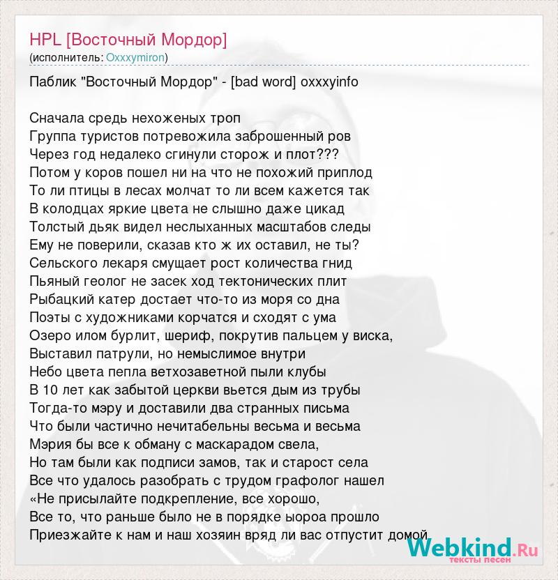 Паблик "Восточный Мордор" - [bad word] oxxxyinfo Сначала средь нехоженых троп Группа туристов потревожила заброшенный ров Через год недалеко сгинули сторож и плот??? Потом у коров пошел ни на что не похожий приплод То ли птицы в лесах молчат то ли всем кажется так В колодцах яркие цвета не слышно даже цикад Толстый дьяк видел неслыханных масштабов следы Ему не поверили, сказав кто ж их оставил, не ты? Сельского лекаря смущает рост количества гнид Пьяный геолог не засек ход тектонических плит Рыбацкий катер достает что-то из моря со дна Поэты с художниками корчатся и сходят с ума Озеро илом бурлит, шериф, покрутив пальцем у виска, Выставил патрули, но немыслимое внутри Небо цвета пепла ветхозаветной пыли клубы В 10 лет как забытой церкви вьется дым из трубы Тогда-то мэру и доставили два странных письма Что были частично нечитабельны весьма и весьма Мэрия бы все к обману с маскарадом свела, Но там были как подписи замов, так и старост села Все что удалось разобрать с трудом графолог нашел «Не присылайте подкрепление, все хорошо, Все то, что раньше было не в порядке ыороа прошло Приезжайте к нам и наш хозяин вряд ли вас отпустит домой