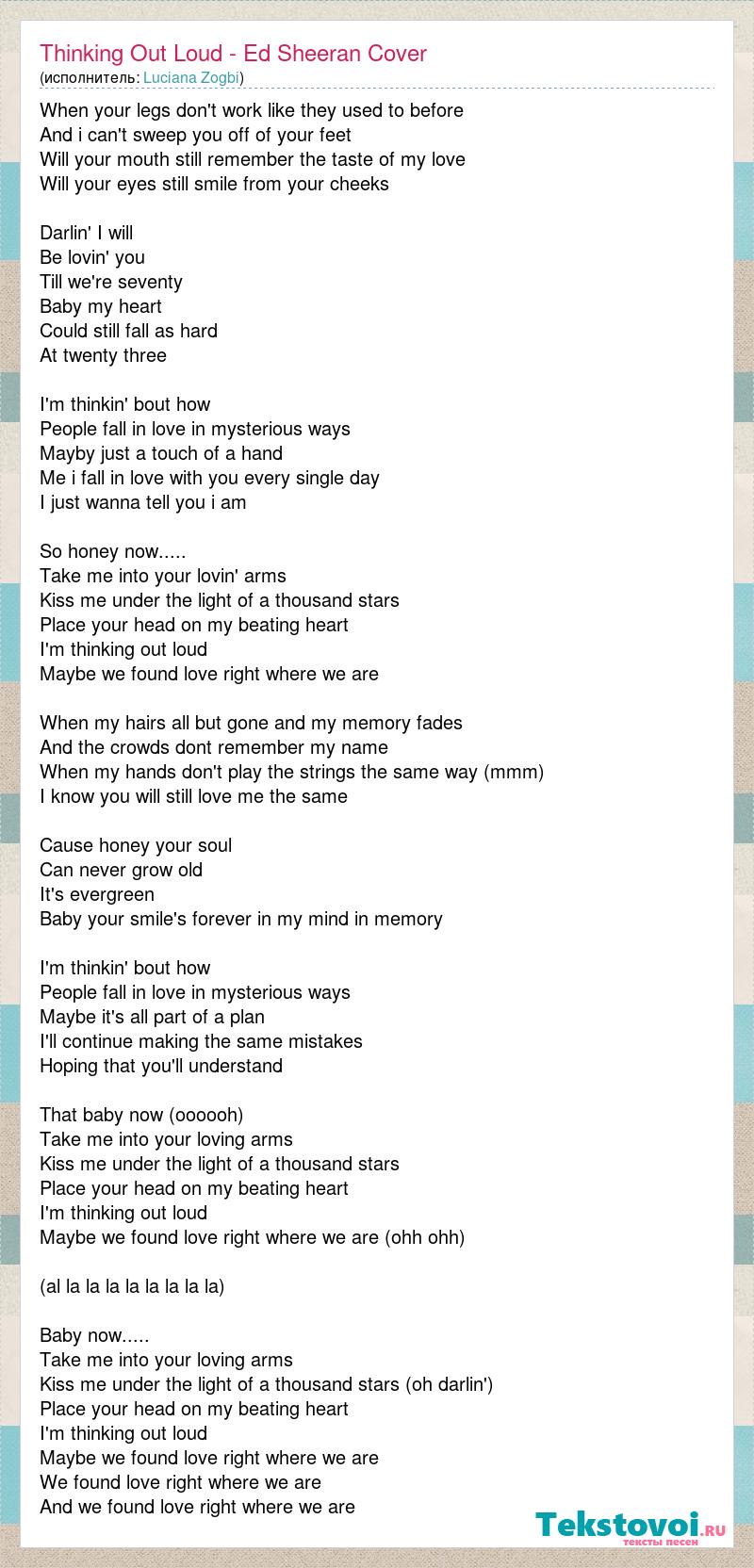 When your legs don't work like they used to before And i can't sweep you off of your feet Will your mouth still remember the taste of my love Will your eyes still smile from your cheeks Darlin' I will Be lovin' you Till we're seventy Baby my heart Could still fall as hard At twenty three I'm thinkin' bout how People fall in love in mysterious ways Mayby just a touch of a hand Me i fall in love with you every single day I just wanna tell you i am So honey now..... Take me into your lovin' arms Kiss me under the light of a thousand stars Place your head on my beating heart I'm thinking out loud Maybe we found love right where we are When my hairs all but gone and my memory fades And the crowds dont remember my name When my hands don't play the strings the same way (mmm) I know you will still love me the same Cause honey your soul Can never grow old It's evergreen Baby your smile's forever in my mind in memory I'm thinkin' bout how People fall in love in mysterious ways Maybe it's all part of a plan I'll continue making the same mistakes Hoping that you'll understand That baby now (oooooh) Take me into your loving arms Kiss me under the light of a thousand stars Place your head on my beating heart I'm thinking out loud Maybe we found love right where we are (ohh ohh) (al la la la la la la la la) Baby now..... Take me into your loving arms Kiss me under the light of a thousand stars (oh darlin') Place your head on my beating heart I'm thinking out loud Maybe we found love right where we are We found love right where we are And we found love right where we are
