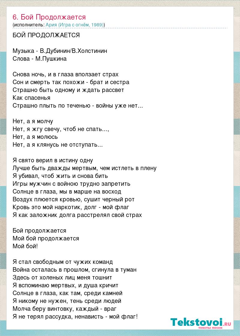 БОЙ ПРОДОЛЖАЕТСЯ Музыка - В.Дубинин/В.Холстинин Слова - М.Пушкина Снова ночь, и в глаза вползает страх Сон и смерть так похожи - брат и сестра Страшно быть одному и ждать рассвет Как спасенья Страшно плыть по теченью - войны уже нет... Нет, а я молчу Нет, я жгу свечу, чтоб не спать..., Нет, а я молюсь Нет, а я клянусь не отступать... Я свято верил в истину одну Лучше быть дважды мертвым, чем истлеть в плену Я убивал, чтоб жить и снова бить Игры мужчин с войною трудно запретить Солнце в глаза, мы в марше на восход Воздух плюется кровью, сушит черный рот Кровь это мой наркотик, долг - мой флаг Я как заложник долга расстрелял свой страх Бой продолжается Мой бой продолжается Мой бой! Я стал свободным от чужих команд Война осталась в прошлом, сгинула в туман Здесь от холеных лиц меня тошнит Я вспоминаю мертвых, и душа кричит Солнце в глаза, как там, среди камней Я никому не нужен, тень среди людей Молча беру винтовку, каждый - враг Я не терял рассудка, ненависть - мой флаг!