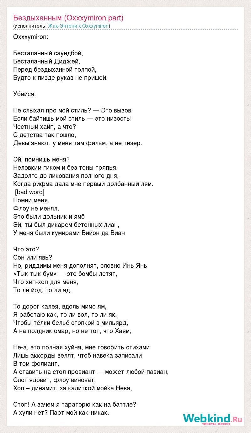 Oxxxymiron: Бесталанный саундбой, Бесталанный Диджей, Перед бездыханной толпой, Будто к пизде рукав не пришей. Убейся. Не слыхал про мой стиль? — Это вызов Если байтишь мой стиль — это низость! Честный хайп, а что? С детства так пошло, Девы знают, у меня там фильм, а не тизер. Эй, помнишь меня? Неловким гиком и без тоны тряпья. Задолго до ликования полного дня, Когда рифма дала мне первый долбанный лям. [bad word] Помни меня, Флоу не менял. Это были дольник и ямб Эй, ты был дикарем бетонных лиан, У меня были кумирами Вийон да Виан Что это? Сон или явь? Но, риддимы меня дополнят, словно Инь Янь «Тык-тык-бум» — это бомбы летят, Что хип-хоп для меня, То ли йод, то ли яд. То дорог калея, вдоль мимо ям, Я работаю как, то ли вол, то ли як, Чтобы тёлки бельё стопкой в мильярд, А на полдник омар, но не тот, что Хаям, Не-а, это полная хуйня, мне говорить стихами Лишь аккорды велят, чтоб навека записали В том фолиант, А ставить на стол провиант — может любой павиан, Слог ядовит, флоу виноват, Хоп – динамит, за калиткой мойка Нева, Стоп! А зачем я тараторю как на баттле? А хули нет? Парт мой как-никак.