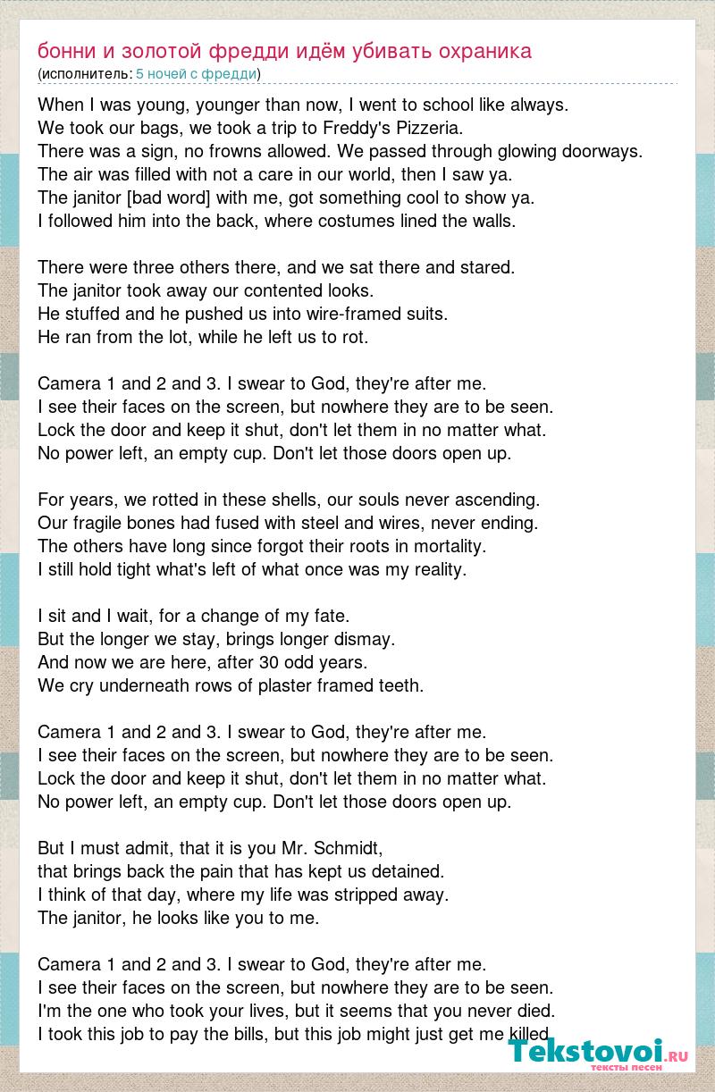 When I was young, younger than now, I went to school like always. We took our bags, we took a trip to Freddy's Pizzeria. There was a sign, no frowns allowed. We passed through glowing doorways. The air was filled with not a care in our world, then I saw ya. The janitor said come with me, got something cool to show ya. I followed him into the back, where costumes lined the walls. There were three others there, and we sat there and stared. The janitor took away our contented looks. He stuffed and he pushed us into wire-framed suits. He ran from the lot, while he left us to rot. Camera 1 and 2 and 3. I swear to God, they're after me. I see their faces on the screen, but nowhere they are to be seen. Lock the door and keep it shut, don't let them in no matter what. No power left, an empty cup. Don't let those doors open up. For years, we rotted in these shells, our souls never ascending. Our fragile bones had fused with steel and wires, never ending. The others have long since forgot their roots in mortality. I still hold tight what's left of what once was my reality. I sit and I wait, for a change of my fate. But the longer we stay, brings longer dismay. And now we are here, after 30 odd years. We cry underneath rows of plaster framed teeth. Camera 1 and 2 and 3. I swear to God, they're after me. I see their faces on the screen, but nowhere they are to be seen. Lock the door and keep it shut, don't let them in no matter what. No power left, an empty cup. Don't let those doors open up. But I must admit, that it is you Mr. Schmidt, that brings back the pain that has kept us detained. I think of that day, where my life was stripped away. The janitor, he looks like you to me. Camera 1 and 2 and 3. I swear to God, they're after me. I see their faces on the screen, but nowhere they are to be seen. I'm the one who took your lives, but it seems that you never died. I took this job to pay the bills, but this job might just get me killed.