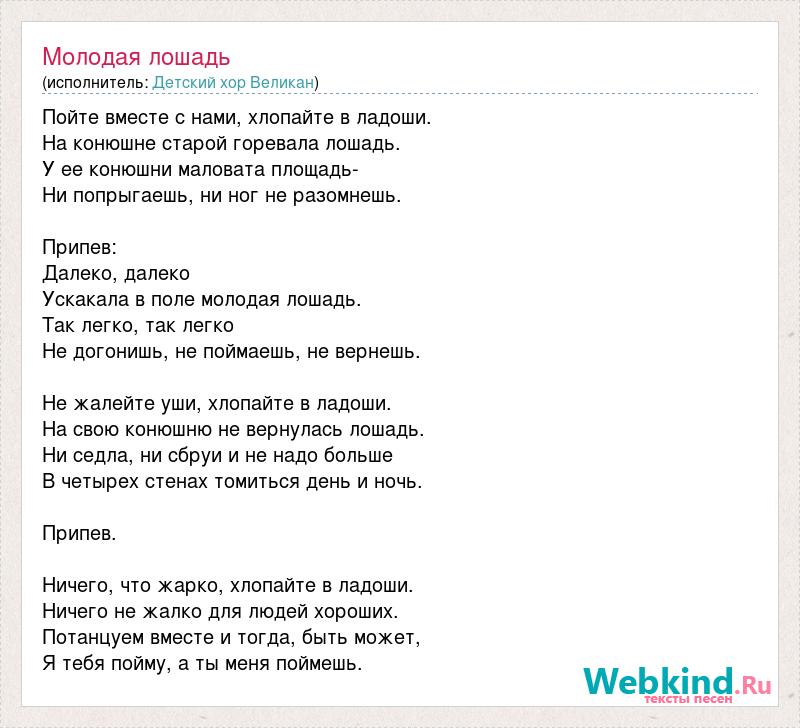 Пойте вместе с нами, хлопайте в ладоши. На конюшне старой горевала лошадь. У ее конюшни маловата площадь- Ни попрыгаешь, ни ног не разомнешь. Припев: Далеко, далеко Ускакала в поле молодая лошадь. Так легко, так легко Не догонишь, не поймаешь, не вернешь. Не жалейте уши, хлопайте в ладоши. На свою конюшню не вернулась лошадь. Ни седла, ни сбруи и не надо больше В четырех стенах томиться день и ночь. Припев. Ничего, что жарко, хлопайте в ладоши. Ничего не жалко для людей хороших. Потанцуем вместе и тогда, быть может, Я тебя пойму, а ты меня поймешь.