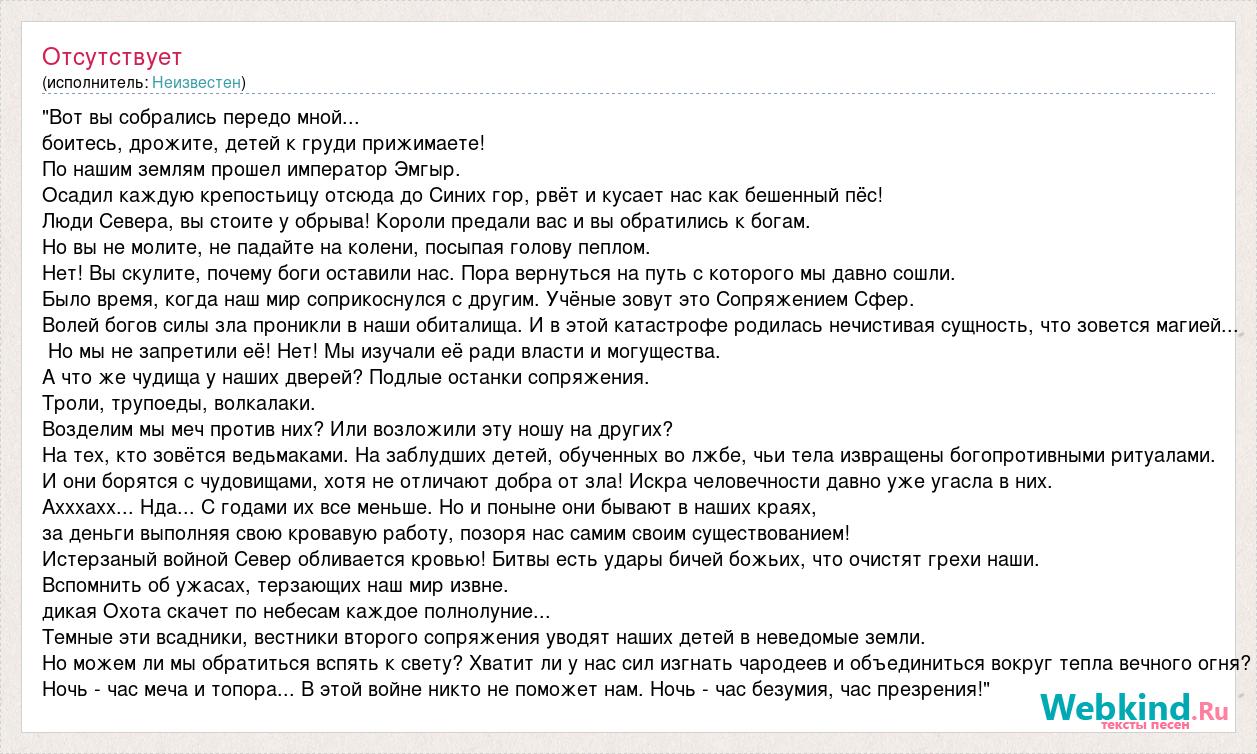 "Вот вы собрались передо мной... боитесь, дрожите, детей к груди прижимаете! По нашим землям прошел император Эмгыр. Осадил каждую крепостьицу отсюда до Синих гор, рвёт и кусает нас как бешенный пёс! Люди Севера, вы стоите у обрыва! Короли предали вас и вы обратились к богам. Но вы не молите, не падайте на колени, посыпая голову пеплом. Нет! Вы скулите, почему боги оставили нас. Пора вернуться на путь с которого мы давно сошли. Было время, когда наш мир соприкоснулся с другим. Учёные зовут это Сопряжением Сфер. Волей богов силы зла проникли в наши обиталища. И в этой катастрофе родилась нечистивая сущность, что зовется магией... Но мы не запретили её! Нет! Мы изучали её ради власти и могущества. А что же чудища у наших дверей? Подлые останки сопряжения. Троли, трупоеды, волкалаки. Возделим мы меч против них? Или возложили эту ношу на других? На тех, кто зовётся ведьмаками. На заблудших детей, обученных во лжбе, чьи тела извращены богопротивными ритуалами. И они борятся с чудовищами, хотя не отличают добра от зла! Искра человечности давно уже угасла в них. Ахххахх... Нда... С годами их все меньше. Но и поныне они бывают в наших краях, за деньги выполняя свою кровавую работу, позоря нас самим своим существованием! Истерзаный войной Север обливается кровью! Битвы есть удары бичей божьих, что очистят грехи наши. Вспомнить об ужасах, терзающих наш мир извне. дикая Охота скачет по небесам каждое полнолуние... Темные эти всадники, вестники второго сопряжения уводят наших детей в неведомые земли. Но можем ли мы обратиться вспять к свету? Хватит ли у нас сил изгнать чародеев и объединиться вокруг тепла вечного огня? Ночь - час меча и топора... В этой войне никто не поможет нам. Ночь - час безумия, час презрения!"