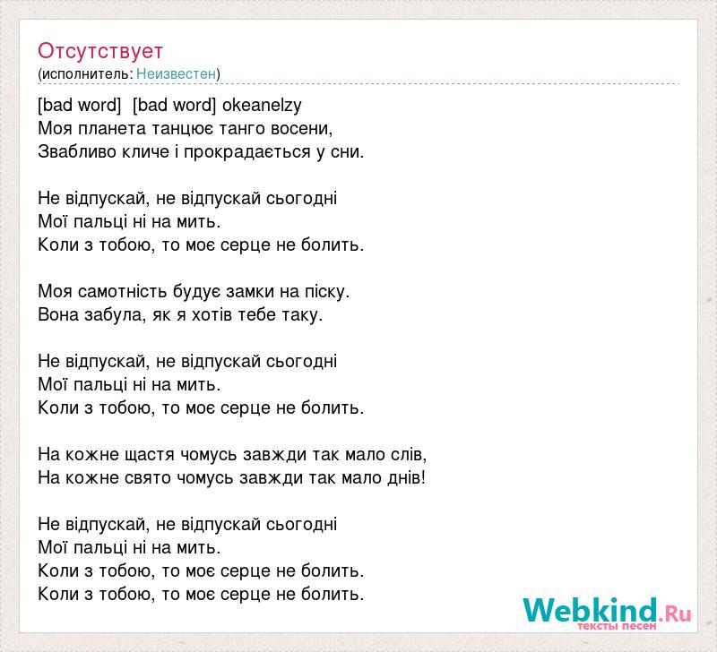 [bad word] [bad word] okeanelzy Моя планета танцює танго восени, Звабливо кличе і прокрадається у сни. Не відпускай, не відпускай сьогодні Мої пальці ні на мить. Коли з тобою, то моє серце не болить. Моя самотність будує замки на піску. Вона забула, як я хотів тебе таку. Не відпускай, не відпускай сьогодні Мої пальці ні на мить. Коли з тобою, то моє серце не болить. На кожне щастя чомусь завжди так мало слів, На кожне свято чомусь завжди так мало днів! Не відпускай, не відпускай сьогодні Мої пальці ні на мить. Коли з тобою, то моє серце не болить. Коли з тобою, то моє серце не болить.
