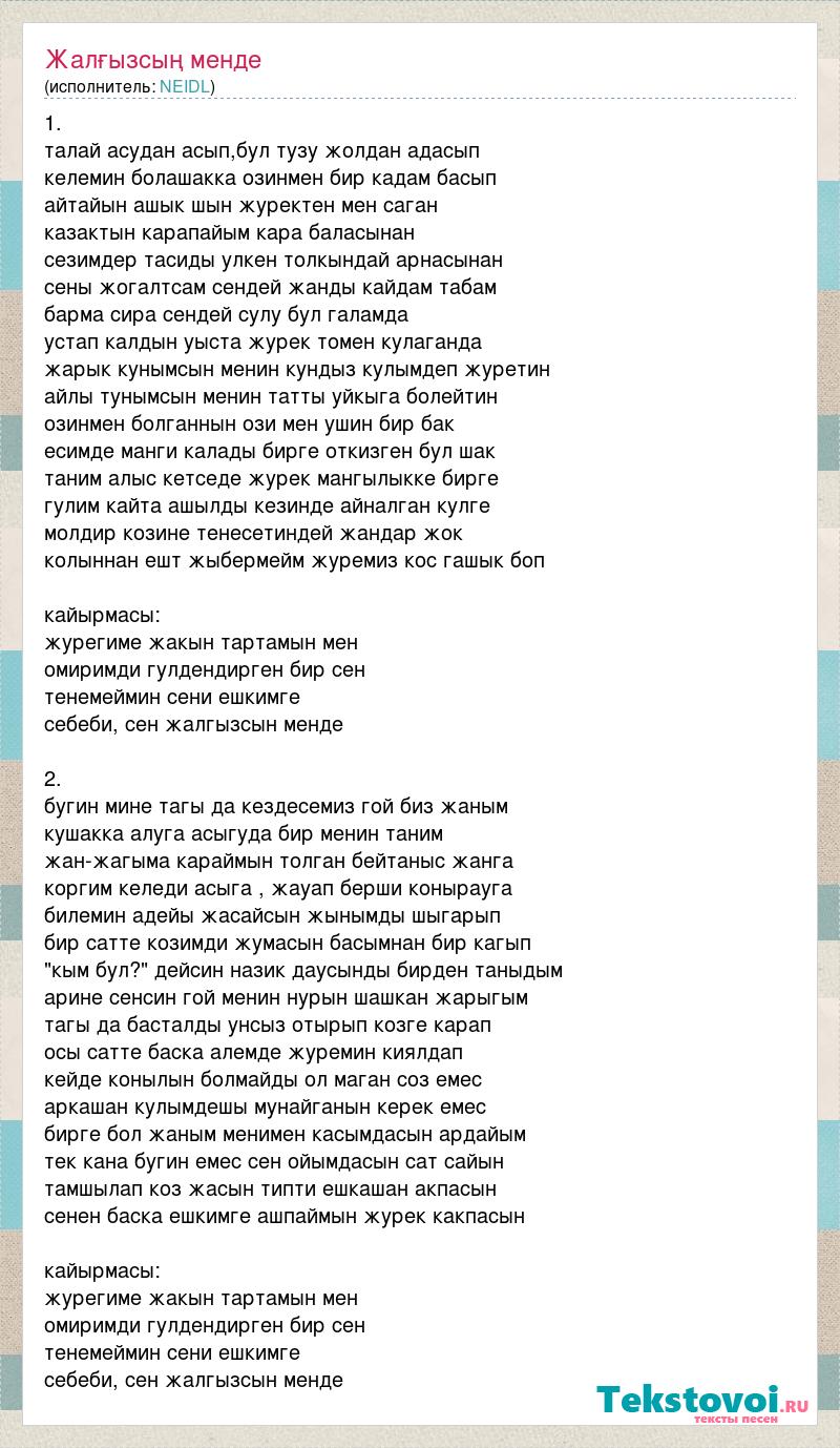 1. талай асудан асып,бул тузу жолдан адасып келемин болашакка озинмен бир кадам басып айтайын ашык шын журектен мен саган казактын карапайым кара баласынан сезимдер тасиды улкен толкындай арнасынан сены жогалтсам сендей жанды кайдам табам барма сира сендей сулу бул галамда устап калдын уыста журек томен кулаганда жарык кунымсын менин кундыз кулымдеп журетин айлы тунымсын менин татты уйкыга болейтин озинмен болганнын ози мен ушин бир бак есимде манги калады бирге откизген бул шак таним алыс кетседе журек мангылыкке бирге гулим кайта ашылды кезинде айналган кулге молдир козине тенесетиндей жандар жок колыннан ешт жыбермейм журемиз кос гашык боп кайырмасы: журегиме жакын тартамын мен омиримди гулдендирген бир сен тенемеймин сени ешкимге себеби, сен жалгызсын менде 2. бугин мине тагы да кездесемиз гой биз жаным кушакка алуга асыгуда бир менин таним жан-жагыма караймын толган бейтаныс жанга коргим келеди асыга , жауап берши конырауга билемин адейы жасайсын жынымды шыгарып бир сатте козимди жумасын басымнан бир кагып "кым бул?" дейсин назик даусынды бирден таныдым арине сенсин гой менин нурын шашкан жарыгым тагы да басталды унсыз отырып козге карап осы сатте баска алемде журемин киялдап кейде конылын болмайды ол маган соз емес аркашан кулымдешы мунайганын керек емес бирге бол жаным менимен касымдасын ардайым тек кана бугин емес сен ойымдасын сат сайын тамшылап коз жасын типти ешкашан акпасын сенен баска ешкимге ашпаймын журек какпасын кайырмасы: журегиме жакын тартамын мен омиримди гулдендирген бир сен тенемеймин сени ешкимге себеби, сен жалгызсын менде