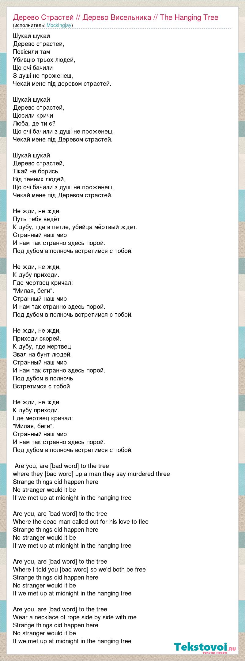 Шукай шукай Дерево страстей, Повісили там Убивцю трьох людей, Що очі бачили З душі не проженеш, Чекай мене під деревом страстей. Шукай шукай Дерево страстей, Щосили кричи Люба, де ти є? Що очі бачили з душі не проженеш, Чекай мене під Деревом страстей. Шукай шукай Дерево страстей, Тікай не борись Від темних людей, Що очі бачили з душі не проженеш, Чекай мене під Деревом страстей. Не жди, не жди, Путь тебя ведёт К дубу, где в петле, убийца мёртвый ждет. Странный наш мир И нам так странно здесь порой. Под дубом в полночь встретимся с тобой. Не жди, не жди, К дубу приходи. Где мертвец кричал: "Милая, беги". Странный наш мир И нам так странно здесь порой. Под дубом в полночь встретимся с тобой. Не жди, не жди, Приходи скорей. К дубу, где мертвец Звал на бунт людей. Странный наш мир И нам так странно здесь порой. Под дубом в полночь Встретимся с тобой Не жди, не жди, К дубу приходи. Где мертвец кричал: "Милая, беги". Странный наш мир И нам так странно здесь порой. Под дубом в полночь встретимся с тобой. Are you, are you coming to the tree where they strung up a man they say murdered three Strange things did happen here No stranger would it be If we met up at midnight in the hanging tree Are you, are you coming to the tree Where the dead man called out for his love to flee Strange things did happen here No stranger would it be If we met up at midnight in the hanging tree Are you, are you coming to the tree Where I told you to run so we'd both be free Strange things did happen here No stranger would it be If we met up at midnight in the hanging tree Are you, are you coming to the tree Wear a necklace of rope side by side with me Strange things did happen here No stranger would it be If we met up at midnight in the hanging tree