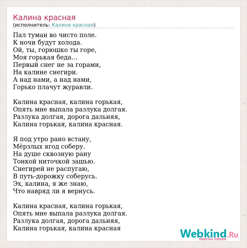 Пал туман во чисто поле. К ночи будут холода. Ой, ты, горюшко ты горе, Моя горькая беда… Первый снег не за горами, На калине снегири. А над нами, а над нами, Горько плачут журавли. Калина красная, калина горькая, Опять мне выпала разлука долгая. Разлука долгая, дорога дальняя, Калина горькая, калина красная. Я под утро рано встану, Мёрзлых ягод соберу. На душе сквозную рану Тонкой ниточкой зашью. Снегирей не распугаю, В путь-дорожку соберусь. Эх, калина, я же знаю, Что навряд ли я вернусь. Калина красная, калина горькая, Опять мне выпала разлука долгая. Разлука долгая, дорога дальняя, Калина горькая, калина красная