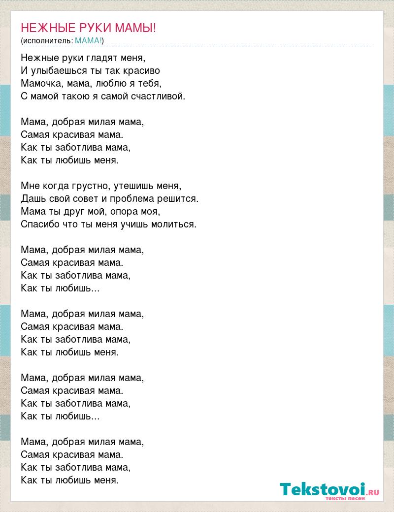 Нежные руки гладят меня, И улыбаешься ты так красиво Мамочка, мама, люблю я тебя, С мамой такою я самой счастливой. Мама, добрая милая мама, Самая красивая мама. Как ты заботлива мама, Как ты любишь меня. Мне когда грустно, утешишь меня, Дашь свой совет и проблема решится. Мама ты друг мой, опора моя, Спасибо что ты меня учишь молиться. Мама, добрая милая мама, Самая красивая мама. Как ты заботлива мама, Как ты любишь... Мама, добрая милая мама, Самая красивая мама. Как ты заботлива мама, Как ты любишь меня. Мама, добрая милая мама, Самая красивая мама. Как ты заботлива мама, Как ты любишь... Мама, добрая милая мама, Самая красивая мама. Как ты заботлива мама, Как ты любишь меня.