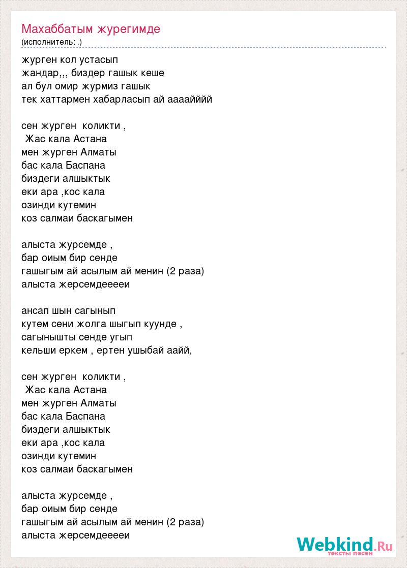 журген кол устасып жандар,,, биздер гашык кеше ал бул омир журмиз гашык тек хаттармен хабарласып ай аааайййй сен журген коликти , Жас кала Астана мен журген Алматы бас кала Баспана биздеги алшыктык еки ара ,кос кала озинди кутемин коз салмаи баскагымен алыста журсемде , бар оиым бир сенде гашыгым ай асылым ай менин (2 раза) алыста жерсемдееееи ансап шын сагынып кутем сени жолга шыгып куунде , сагынышты сенде угып кельши еркем , ертен ушыбай аайй, сен журген коликти , Жас кала Астана мен журген Алматы бас кала Баспана биздеги алшыктык еки ара ,кос кала озинди кутемин коз салмаи баскагымен алыста журсемде , бар оиым бир сенде гашыгым ай асылым ай менин (2 раза) алыста жерсемдееееи