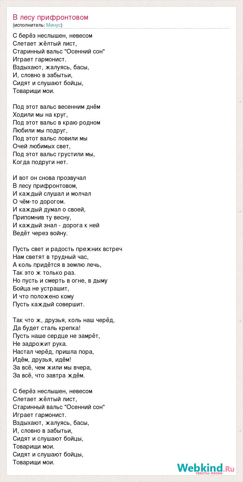 С берёз неслышен, невесом Слетает жёлтый лист, Старинный вальс "Осенний сон" Играет гармонист. Вздыхают, жалуясь, басы, И, словно в забытьи, Сидят и слушают бойцы, Товарищи мои. Под этот вальс весенним днём Ходили мы на круг, Под этот вальс в краю родном Любили мы подруг, Под этот вальс ловили мы Очей любимых свет, Под этот вальс грустили мы, Когда подруги нет. И вот он снова прозвучал В лесу прифронтовом, И каждый слушал и молчал О чём-то дорогом. И каждый думал о своей, Припомнив ту весну, И каждый знал - дорога к ней Ведёт через войну. Пусть свет и радость прежних встреч Нам светят в трудный час, А коль придётся в землю лечь, Так это ж только раз. Но пусть и смерть в огне, в дыму Бойца не устрашит, И что положено кому Пусть каждый совершит. Так что ж, друзья, коль наш черёд, Да будет сталь крепка! Пусть наше сердце не замрёт, Не задрожит рука. Настал черёд, пришла пора, Идём, друзья, идём! За всё, чем жили мы вчера, За всё, что завтра ждём. С берёз неслышен, невесом Слетает жёлтый лист, Старинный вальс "Осенний сон" Играет гармонист. Вздыхают, жалуясь, басы, И, словно в забытьи, Сидят и слушают бойцы, Товарищи мои. Сидят и слушают бойцы, Товарищи мои.