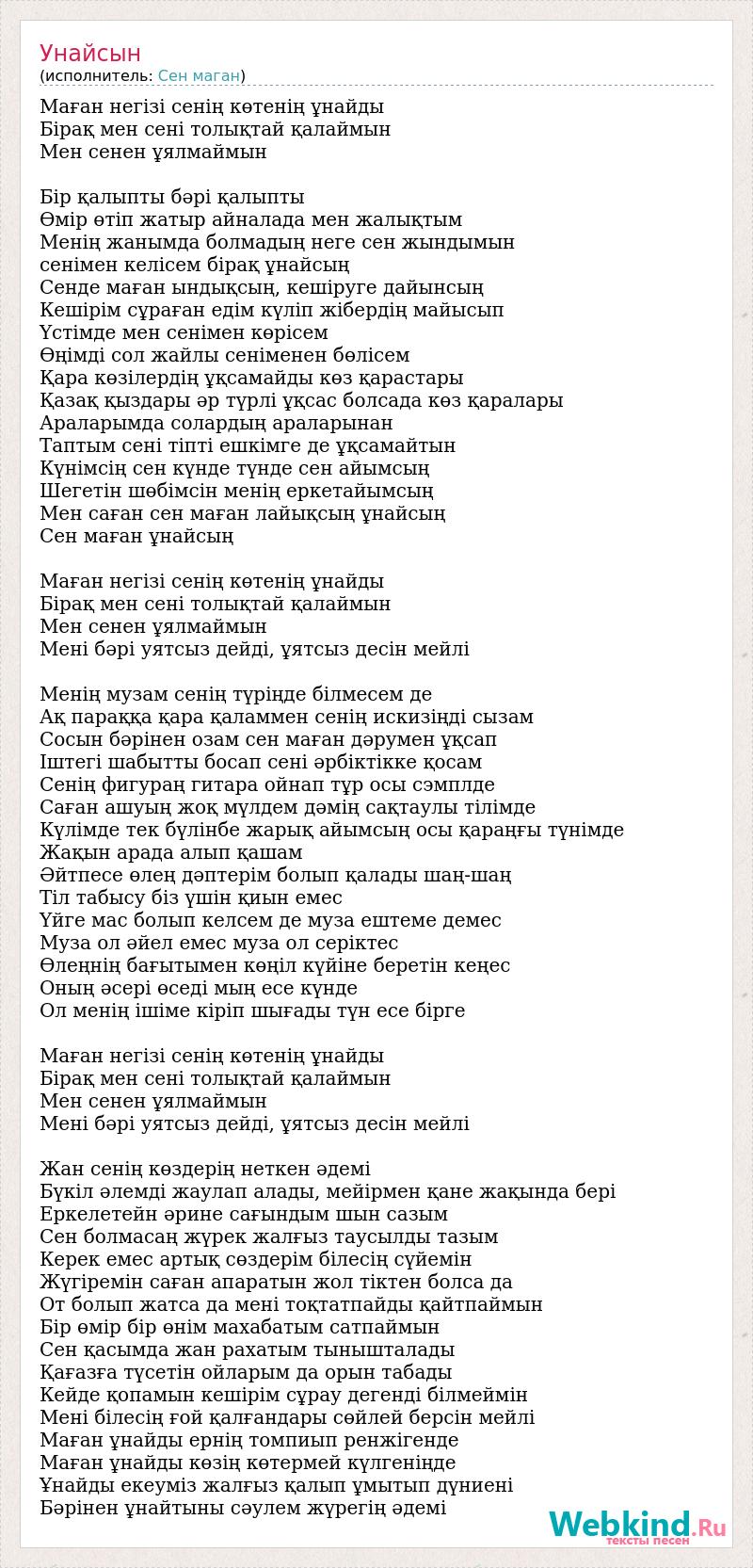 Маған негізі сенің көтенің ұнайды Бірақ мен сені толықтай қалаймын Мен сенен ұялмаймын Бір қалыпты бәрі қалыпты Өмір өтіп жатыр айналада мен жалықтым Менің жанымда болмадың неге сен жындымын сенімен келісем бірақ ұнайсың Сенде маған ындықсың, кешіруге дайынсың Кешірім сұраған едім күліп жібердің майысып Үстімде мен сенімен көрісем Өңімді сол жайлы сеніменен бөлісем Қара көзілердің ұқсамайды көз қарастары Қазақ қыздары әр түрлі ұқсас болсада көз қаралары Араларымда солардың араларынан Таптым сені тіпті ешкімге де ұқсамайтын Күнімсің сен күнде түнде сен айымсың Шегетін шөбімсін менің еркетайымсың Мен саған сен маған лайықсың ұнайсың Сен маған ұнайсың Маған негізі сенің көтенің ұнайды Бірақ мен сені толықтай қалаймын Мен сенен ұялмаймын Мені бәрі уятсыз дейді, ұятсыз десін мейлі Менің музам сенің түріңде білмесем де Ақ параққа қара қаламмен сенің искизіңді сызам Сосын бәрінен озам сен маған дәрумен ұқсап Іштегі шабытты босап сені әрбіктікке қосам Сенің фигураң гитара ойнап тұр осы сэмплде Саған ашуың жоқ мүлдем дәмің сақтаулы тілімде Күлімде тек бүлінбе жарық айымсың осы қараңғы түнімде Жақын арада алып қашам Әйтпесе өлең дәптерім болып қалады шаң-шаң Тіл табысу біз үшін қиын емес Үйге мас болып келсем де муза ештеме демес Муза ол әйел емес муза ол серіктес Өлеңнің бағытымен көңіл күйіне беретін кеңес Оның әсері өседі мың есе күнде Ол менің ішіме кіріп шығады түн есе бірге Маған негізі сенің көтенің ұнайды Бірақ мен сені толықтай қалаймын Мен сенен ұялмаймын Мені бәрі уятсыз дейді, ұятсыз десін мейлі Жан сенің көздерің неткен әдемі Бүкіл әлемді жаулап алады, мейірмен қане жақында бері Еркелетейн әрине сағындым шын сазым Сен болмасаң жүрек жалғыз таусылды тазым Керек емес артық сөздерім білесің сүйемін Жүгіремін саған апаратын жол тіктен болса да От болып жатса да мені тоқтатпайды қайтпаймын Бір өмір бір өнім махабатым сатпаймын Сен қасымда жан рахатым тынышталады Қағазға түсетін ойларым да орын табады Кейде қопамын кешірім сұрау дегенді білмеймін Мені білесің ғой қалғандары сөйлей берсін мейлі Маған ұнайды ернің томпиып ренжігенде Маған ұнайды көзің көтермей күлгеніңде Ұнайды екеуміз жалғыз қалып ұмытып дүниені Бәрінен ұнайтыны сәулем жүрегің әдемі