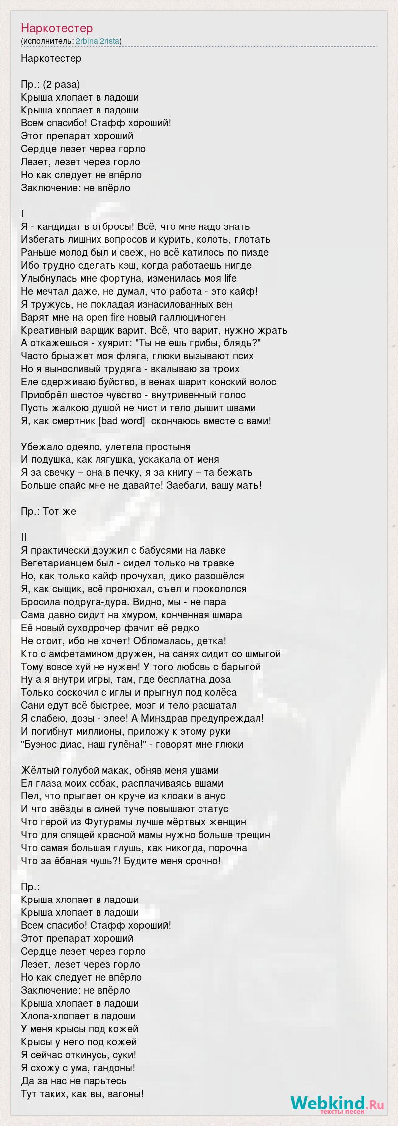 Наркотестер Пр.: (2 раза) Крыша хлопает в ладоши Крыша хлопает в ладоши Всем спасибо! Стафф хороший! Этот препарат хороший Сердце лезет через горло Лезет, лезет через горло Но как следует не впёрло Заключение: не впёрло I Я - кандидат в отбросы! Всё, что мне надо знать Избегать лишних вопросов и курить, колоть, глотать Раньше молод был и свеж, но всё катилось по пизде Ибо трудно сделать кэш, когда работаешь нигде Улыбнулась мне фортуна, изменилась моя life Не мечтал даже, не думал, что работа - это кайф! Я тружусь, не покладая изнасилованных вен Варят мне на open fire новый галлюциноген Креативный варщик варит. Всё, что варит, нужно жрать А откажешься - хуярит: "Ты не ешь грибы, блядь?" Часто брызжет моя фляга, глюки вызывают псих Но я выносливый трудяга - вкалываю за троих Еле сдерживаю буйство, в венах шарит конский волос Приобрёл шестое чувство - внутривенный голос Пусть жалкою душой не чист и тело дышит швами Я, как смертник [bad word] скончаюсь вместе с вами! Убежало одеяло, улетела простыня И подушка, как лягушка, ускакала от меня Я за свечку – она в печку, я за книгу – та бежать Больше спайс мне не давайте! Заебали, вашу мать! Пр.: Тот же II Я практически дружил с бабусями на лавке Вегетарианцем был - сидел только на травке Но, как только кайф прочухал, дико разошёлся Я, как сыщик, всё пронюхал, съел и прокололся Бросила подруга-дура. Видно, мы - не пара Сама давно сидит на хмуром, конченная шмара Её новый суходрочер фачит её редко Не стоит, ибо не хочет! Обломалась, детка! Кто с амфетамином дружен, на санях сидит со шмыгой Тому вовсе хуй не нужен! У того любовь с барыгой Ну а я внутри игры, там, где бесплатна доза Только соскочил с иглы и прыгнул под колёса Сани едут всё быстрее, мозг и тело расшатал Я слабею, дозы - злее! А Минздрав предупреждал! И погибнут миллионы, приложу к этому руки "Буэнос диас, наш гулёна!" - говорят мне глюки Жёлтый голубой макак, обняв меня ушами Ел глаза моих собак, расплачиваясь вшами Пел, что прыгает он круче из клоаки в анус И что звёзды в синей туче повышают статус Что герой из Футурамы лучше мёртвых женщин Что для спящей красной мамы нужно больше трещин Что самая большая глушь, как никогда, порочна Что за ёбаная чушь?! Будите меня срочно! Пр.: Крыша хлопает в ладоши Крыша хлопает в ладоши Всем спасибо! Стафф хороший! Этот препарат хороший Сердце лезет через горло Лезет, лезет через горло Но как следует не впёрло Заключение: не впёрло Крыша хлопает в ладоши Хлопа-хлопает в ладоши У меня крысы под кожей Крысы у него под кожей Я сейчас откинусь, суки! Я схожу с ума, гандоны! Да за нас не парьтесь Тут таких, как вы, вагоны!