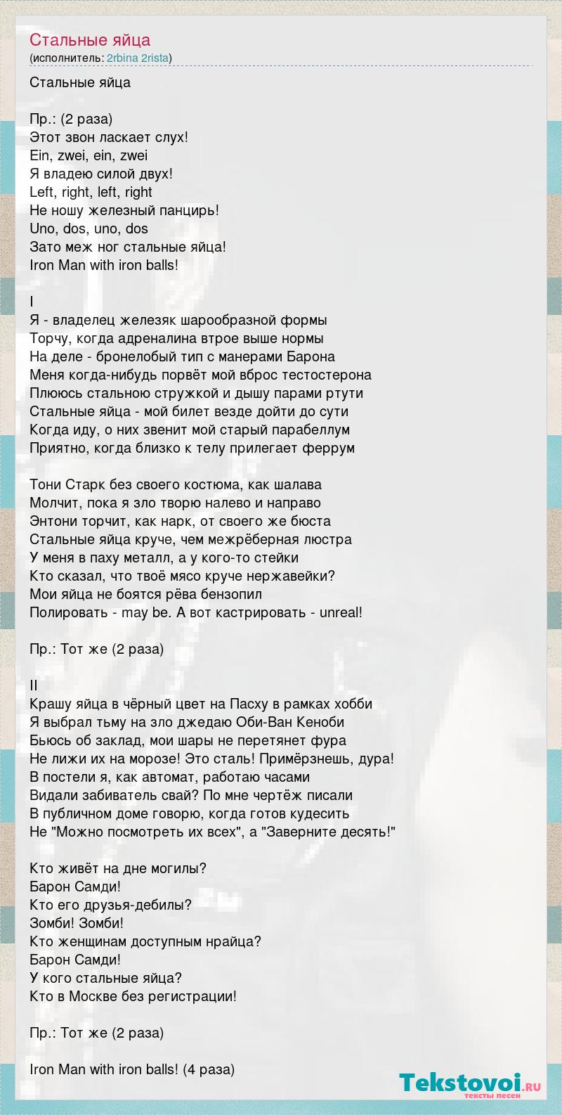 Стальные яйца Пр.: (2 раза) Этот звон ласкает слух! Ein, zwei, ein, zwei Я владею силой двух! Left, right, left, right Не ношу железный панцирь! Uno, dos, uno, dos Зато меж ног стальные яйца! Iron Man with iron balls! I Я - владелец железяк шарообразной формы Торчу, когда адреналина втрое выше нормы На деле - бронелобый тип с манерами Барона Меня когда-нибудь порвёт мой вброс тестостерона Плююсь стальною стружкой и дышу парами ртути Стальные яйца - мой билет везде дойти до сути Когда иду, о них звенит мой старый парабеллум Приятно, когда близко к телу прилегает феррум Тони Старк без своего костюма, как шалава Молчит, пока я зло творю налево и направо Энтони торчит, как нарк, от своего же бюста Стальные яйца круче, чем межрёберная люстра У меня в паху металл, а у кого-то стейки Кто сказал, что твоё мясо круче нержавейки? Мои яйца не боятся рёва бензопил Полировать - may be. А вот кастрировать - unreal! Пр.: Тот же (2 раза) II Крашу яйца в чёрный цвет на Пасху в рамках хобби Я выбрал тьму на зло джедаю Оби-Ван Кеноби Бьюсь об заклад, мои шары не перетянет фура Не лижи их на морозе! Это сталь! Примёрзнешь, дура! В постели я, как автомат, работаю часами Видали забиватель свай? По мне чертёж писали В публичном доме говорю, когда готов кудесить Не "Можно посмотреть их всех", а "Заверните десять!" Кто живёт на дне могилы? Барон Самди! Кто его друзья-дебилы? Зомби! Зомби! Кто женщинам доступным нрайца? Барон Самди! У кого стальные яйца? Кто в Москве без регистрации! Пр.: Тот же (2 раза) Iron Man with iron balls! (4 раза)