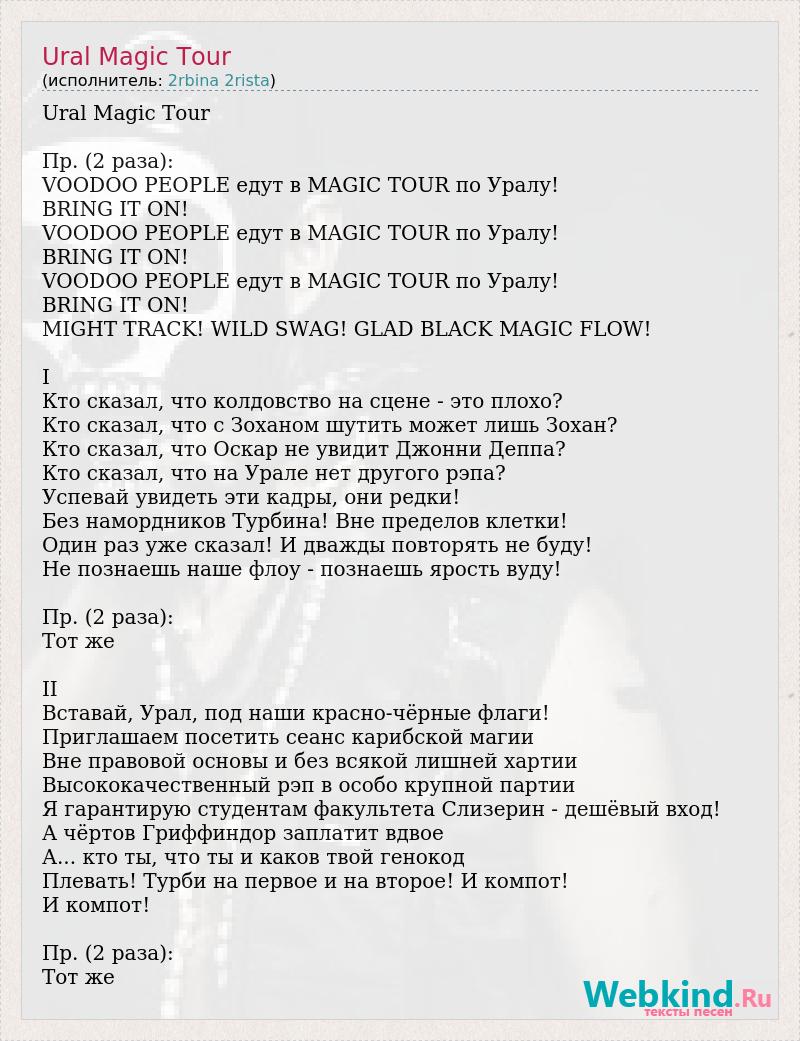 Ural Magic Tour Пр. (2 раза): VOODOO PEOPLE едут в MAGIC TOUR по Уралу! BRING IT ON! VOODOO PEOPLE едут в MAGIC TOUR по Уралу! BRING IT ON! VOODOO PEOPLE едут в MAGIC TOUR по Уралу! BRING IT ON! MIGHT TRACK! WILD SWAG! GLAD BLACK MAGIC FLOW! I Кто сказал, что колдовство на сцене - это плохо? Кто сказал, что с Зоханом шутить может лишь Зохан? Кто сказал, что Оскар не увидит Джонни Деппа? Кто сказал, что на Урале нет другого рэпа? Успевай увидеть эти кадры, они редки! Без намордников Турбина! Вне пределов клетки! Один раз уже сказал! И дважды повторять не буду! Не познаешь наше флоу - познаешь ярость вуду! Пр. (2 раза): Тот же II Вставай, Урал, под наши красно-чёрные флаги! Приглашаем посетить сеанс карибской магии Вне правовой основы и без всякой лишней хартии Высококачественный рэп в особо крупной партии Я гарантирую студентам факультета Слизерин - дешёвый вход! А чёртов Гриффиндор заплатит вдвое А... кто ты, что ты и каков твой генокод Плевать! Турби на первое и на второе! И компот! И компот! Пр. (2 раза): Тот же