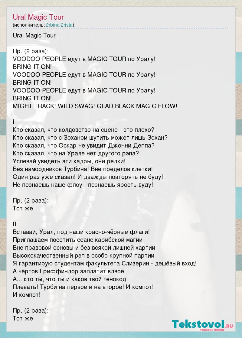 Ural Magic Tour Пр. (2 раза): VOODOO PEOPLE едут в MAGIC TOUR по Уралу! BRING IT ON! VOODOO PEOPLE едут в MAGIC TOUR по Уралу! BRING IT ON! VOODOO PEOPLE едут в MAGIC TOUR по Уралу! BRING IT ON! MIGHT TRACK! WILD SWAG! GLAD BLACK MAGIC FLOW! I Кто сказал, что колдовство на сцене - это плохо? Кто сказал, что с Зоханом шутить может лишь Зохан? Кто сказал, что Оскар не увидит Джонни Деппа? Кто сказал, что на Урале нет другого рэпа? Успевай увидеть эти кадры, они редки! Без намордников Турбина! Вне пределов клетки! Один раз уже сказал! И дважды повторять не буду! Не познаешь наше флоу - познаешь ярость вуду! Пр. (2 раза): Тот же II Вставай, Урал, под наши красно-чёрные флаги! Приглашаем посетить сеанс карибской магии Вне правовой основы и без всякой лишней хартии Высококачественный рэп в особо крупной партии Я гарантирую студентам факультета Слизерин - дешёвый вход! А чёртов Гриффиндор заплатит вдвое А... кто ты, что ты и каков твой генокод Плевать! Турби на первое и на второе! И компот! И компот! Пр. (2 раза): Тот же