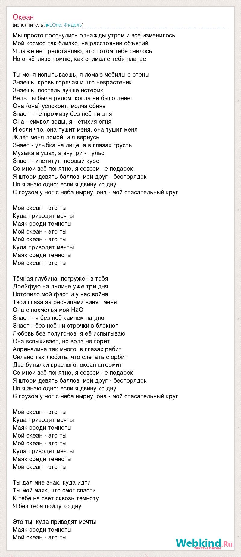 Мы просто проснулись однажды утром и всё изменилось Мой космос так близко, на расстоянии объятий Я даже не представляю, что потом тебе снилось Но отчётливо помню, как снимал с тебя платье Ты меня испытываешь, я ломаю мобилы о стены Знаешь, кровь горячая и что неврастеник Знаешь, постель лучше истерик Ведь ты была рядом, когда не было денег Она (она) успокоит, молча обняв Знает - не проживу без неё ни дня Она - символ воды, я - стихия огня И если что, она тушит меня, она тушит меня Ждёт меня домой, и я вернусь Знает - улыбка на лице, а в глазах грусть Музыка в ушах, а внутри - пульс Знает - институт, первый курс Со мной всё понятно, я совсем не подарок Я шторм девять баллов, мой друг - беспорядок Но я знаю одно: если я двину ко дну С грузом у ног с неба нырну, она - мой спасательный круг Мой океан - это ты Куда приводят мечты Маяк среди темноты Мой океан - это ты Мой океан - это ты Куда приводят мечты Маяк среди темноты Мой океан - это ты Тёмная глубина, погружен в тебя Дрейфую на льдине уже три дня Потопило мой флот и у нас война Твои глаза за ресницами винят меня Она с похмелья мой H2O Знает - я без неё камнем на дно Знает - без неё ни строчки в блокнот Любовь без полутонов, я её испытываю Она вспыхивает, но вода не горит Адреналина так много, в глазах рябит Сильно так любить, что слетать с орбит Две бутылки красного, океан штормит Со мной всё понятно, я совсем не подарок Я шторм девять баллов, мой друг - беспорядок Но я знаю одно: если я двину ко дну С грузом у ног с неба нырну, она - мой спасательный круг Мой океан - это ты Куда приводят мечты Маяк среди темноты Мой океан - это ты Мой океан - это ты Куда приводят мечты Маяк среди темноты Мой океан - это ты Ты дал мне знак, куда идти Ты мой маяк, что смог спасти К тебе на свет сквозь темноту Я без тебя пойду ко дну Это ты, куда приводят мечты Маяк среди темноты Мой океан - это ты