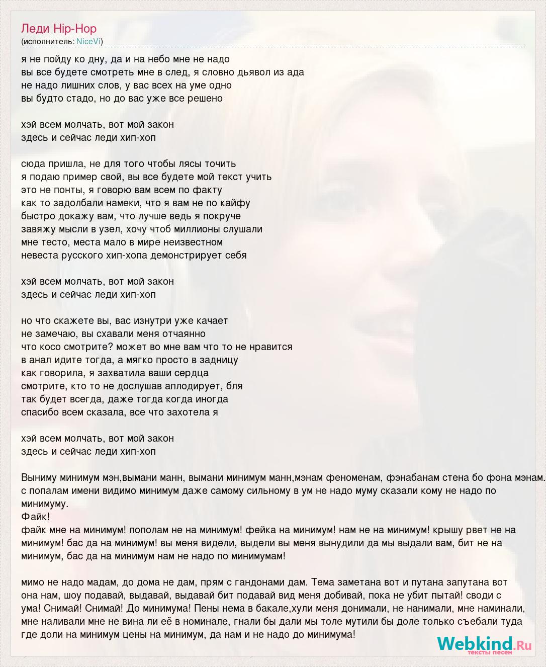 я не пойду ко дну, да и на небо мне не надо вы все будете смотреть мне в след, я словно дьявол из ада не надо лишних слов, у вас всех на уме одно вы будто стадо, но до вас уже все решено хэй всем молчать, вот мой закон здесь и сейчас леди хип-хоп сюда пришла, не для того чтобы лясы точить я подаю пример свой, вы все будете мой текст учить это не понты, я говорю вам всем по факту как то задолбали намеки, что я вам не по кайфу быстро докажу вам, что лучше ведь я покруче завяжу мысли в узел, хочу чтоб миллионы слушали мне тесто, места мало в мире неизвестном невеста русского хип-хопа демонстрирует себя хэй всем молчать, вот мой закон здесь и сейчас леди хип-хоп но что скажете вы, вас изнутри уже качает не замечаю, вы схавали меня отчаянно что косо смотрите? может во мне вам что то не нравится в анал идите тогда, а мягко просто в задницу как говорила, я захватила ваши сердца смотрите, кто то не дослушав аплодирует, бля так будет всегда, даже тогда когда иногда спасибо всем сказала, все что захотела я хэй всем молчать, вот мой закон здесь и сейчас леди хип-хоп Выниму минимум мэн,вымани манн, вымани минимум манн,мэнам феноменам, фэнабанам стена бо фона мэнам. с попалам имени видимо минимум даже самому сильному в ум не надо муму сказали кому не надо по минимуму. Файк! файк мне на минимум! пополам не на минимум! фейка на минимум! нам не на минимум! крышу рвет не на минимум! бас да на минимум! вы меня видели, выдели вы меня вынудили да мы выдали вам, бит не на минимум, бас да на минимум нам не надо по минимумам! мимо не надо мадам, до дома не дам, прям с гандонами дам. Тема заметана вот и путана запутана вот она нам, шоу подавай, выдавай, выдавай бит подавай вид меня добивай, пока не убит пытай! своди с ума! Снимай! Снимай! До минимума! Пены нема в бакале,хули меня донимали, не нанимали, мне наминали, мне наливали мне не вина ли её в номинале, гнали бы дали мы толе мутили бы доле только съебали туда где доли на минимум цены на минимум, да нам и не надо до минимума!