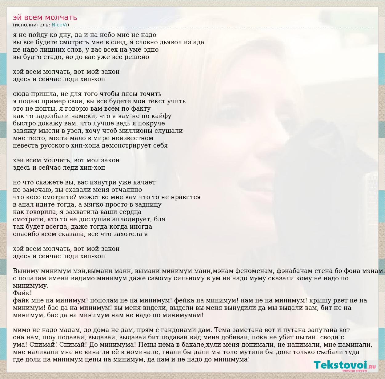 я не пойду ко дну, да и на небо мне не надо вы все будете смотреть мне в след, я словно дьявол из ада не надо лишних слов, у вас всех на уме одно вы будто стадо, но до вас уже все решено хэй всем молчать, вот мой закон здесь и сейчас леди хип-хоп сюда пришла, не для того чтобы лясы точить я подаю пример свой, вы все будете мой текст учить это не понты, я говорю вам всем по факту как то задолбали намеки, что я вам не по кайфу быстро докажу вам, что лучше ведь я покруче завяжу мысли в узел, хочу чтоб миллионы слушали мне тесто, места мало в мире неизвестном невеста русского хип-хопа демонстрирует себя хэй всем молчать, вот мой закон здесь и сейчас леди хип-хоп но что скажете вы, вас изнутри уже качает не замечаю, вы схавали меня отчаянно что косо смотрите? может во мне вам что то не нравится в анал идите тогда, а мягко просто в задницу как говорила, я захватила ваши сердца смотрите, кто то не дослушав аплодирует, бля так будет всегда, даже тогда когда иногда спасибо всем сказала, все что захотела я хэй всем молчать, вот мой закон здесь и сейчас леди хип-хоп Выниму минимум мэн,вымани манн, вымани минимум манн,мэнам феноменам, фэнабанам стена бо фона мэнам. с попалам имени видимо минимум даже самому сильному в ум не надо муму сказали кому не надо по минимуму. Файк! файк мне на минимум! пополам не на минимум! фейка на минимум! нам не на минимум! крышу рвет не на минимум! бас да на минимум! вы меня видели, выдели вы меня вынудили да мы выдали вам, бит не на минимум, бас да на минимум нам не надо по минимумам! мимо не надо мадам, до дома не дам, прям с гандонами дам. Тема заметана вот и путана запутана вот она нам, шоу подавай, выдавай, выдавай бит подавай вид меня добивай, пока не убит пытай! своди с ума! Снимай! Снимай! До минимума! Пены нема в бакале,хули меня донимали, не нанимали, мне наминали, мне наливали мне не вина ли её в номинале, гнали бы дали мы толе мутили бы доле только съебали туда где доли на минимум цены на минимум, да нам и не надо до минимума!