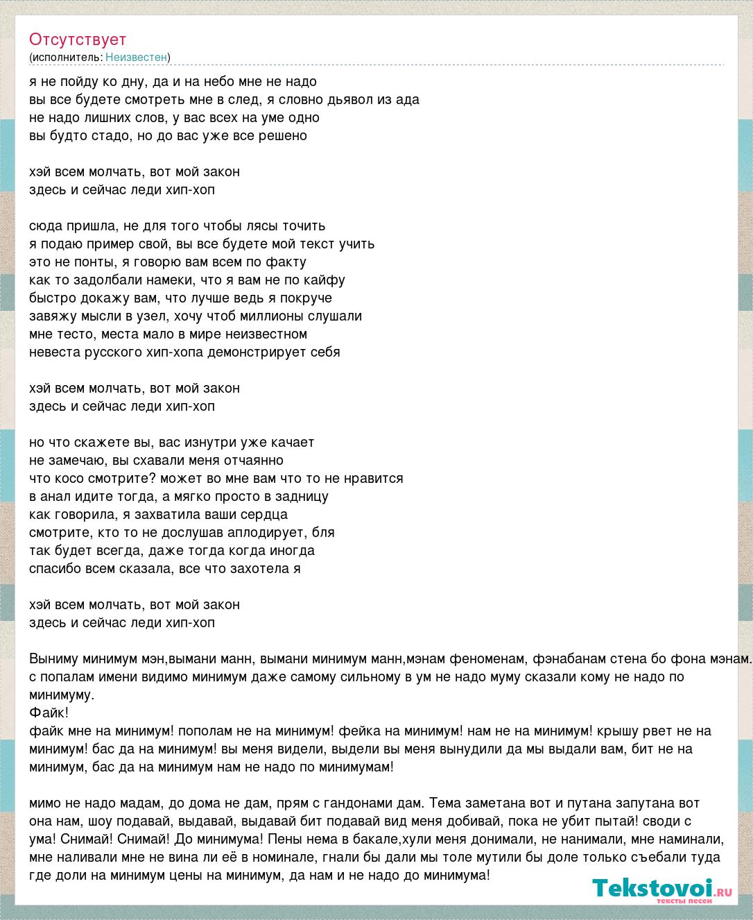 я не пойду ко дну, да и на небо мне не надо вы все будете смотреть мне в след, я словно дьявол из ада не надо лишних слов, у вас всех на уме одно вы будто стадо, но до вас уже все решено хэй всем молчать, вот мой закон здесь и сейчас леди хип-хоп сюда пришла, не для того чтобы лясы точить я подаю пример свой, вы все будете мой текст учить это не понты, я говорю вам всем по факту как то задолбали намеки, что я вам не по кайфу быстро докажу вам, что лучше ведь я покруче завяжу мысли в узел, хочу чтоб миллионы слушали мне тесто, места мало в мире неизвестном невеста русского хип-хопа демонстрирует себя хэй всем молчать, вот мой закон здесь и сейчас леди хип-хоп но что скажете вы, вас изнутри уже качает не замечаю, вы схавали меня отчаянно что косо смотрите? может во мне вам что то не нравится в анал идите тогда, а мягко просто в задницу как говорила, я захватила ваши сердца смотрите, кто то не дослушав аплодирует, бля так будет всегда, даже тогда когда иногда спасибо всем сказала, все что захотела я хэй всем молчать, вот мой закон здесь и сейчас леди хип-хоп Выниму минимум мэн,вымани манн, вымани минимум манн,мэнам феноменам, фэнабанам стена бо фона мэнам. с попалам имени видимо минимум даже самому сильному в ум не надо муму сказали кому не надо по минимуму. Файк! файк мне на минимум! пополам не на минимум! фейка на минимум! нам не на минимум! крышу рвет не на минимум! бас да на минимум! вы меня видели, выдели вы меня вынудили да мы выдали вам, бит не на минимум, бас да на минимум нам не надо по минимумам! мимо не надо мадам, до дома не дам, прям с гандонами дам. Тема заметана вот и путана запутана вот она нам, шоу подавай, выдавай, выдавай бит подавай вид меня добивай, пока не убит пытай! своди с ума! Снимай! Снимай! До минимума! Пены нема в бакале,хули меня донимали, не нанимали, мне наминали, мне наливали мне не вина ли её в номинале, гнали бы дали мы толе мутили бы доле только съебали туда где доли на минимум цены на минимум, да нам и не надо до минимума!
