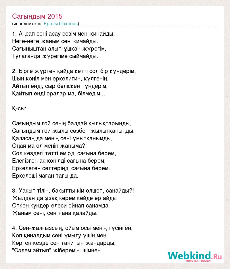 1. Аңсап сені асау сезім мені қинайды, Неге-неге жаным сені қимайды. Сағыныштан алып-ұшқан жүрегім, Тулағанда жүрегіме сыймайды. 2. Бірге жүрген қайда кетті сол бір күндерім, Шын көңіл мен еркелигин, күлгенің. Айтып әнді, сыр бөліскен түндерім, Қайтып енді оралар ма, білмедім... Қ-сы: Сағындым ғой сенің балдай қылықтарыңды, Сағындым ғой жылы сөзбен жылытқаныңды. Қаласаң да менің сені ұмытқанымды, Оңай ма ол менің жаныма?! Сол кездегі тәтті өмірді сағына берем, Елегізген ақ көңілді сағына берем, Еркелеген сәттеріңді сағына берем. Еркелеші маған тағы да. 3. Уақыт тілін, бақытты кім өлшеп, санайды?! Жылдан да ұзақ көрем кейде әр айды Откен кундер елеси ойнап санамда Жаным сені, сені ғана қалайды. 4. Сен-жалғызсың, ойым осы менің түсінген, Көп қиналдым сені ұмыту үшін мен. Көрген кезде сен танитын жандарды, "Сәлем айтып" жіберемін ішімнен...
