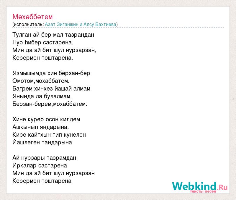 Тулган ай бер мал тазрандан Нур hибер састарена. Мин да ай бит шул нурзарзан, Керермен тоштарена. Язмышымда хин берзан-бер Омотом,мохаббатем. Багрем хинхез йашай алмам Янында ла булалмам. Берзан-берем,мохаббатем. Хине курер осон килдем Ашкынып яндарына. Кире кайтхын тип кунелен Йашлеген тандарына Ай нурзары тазрамдан Иркалар састарена Мин да ай бит шул нурзарзан Керермен тоштарена