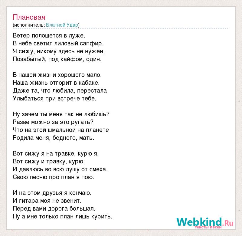 Ветер полощется в луже. В небе светит лиловый сапфир. Я сижу, никому здесь не нужен, Позабытый, под кайфом, один. В нашей жизни хорошего мало. Наша жизнь отгорит в кабаке. Даже та, что любила, перестала Улыбаться при встрече тебе. Ну зачем ты меня так не любишь? Разве можно за это ругать? Что на этой шмальной на планете Родила меня, бедного, мать. Вот сижу я на травке, курю я. Вот сижу и травку, курю. И давлюсь во всю душу от смеха. Свою песню про план я пою. И на этом друзья я кончаю. И гитара моя не звенит. Перед вами дорога большая. Ну а мне только план лишь курить.
