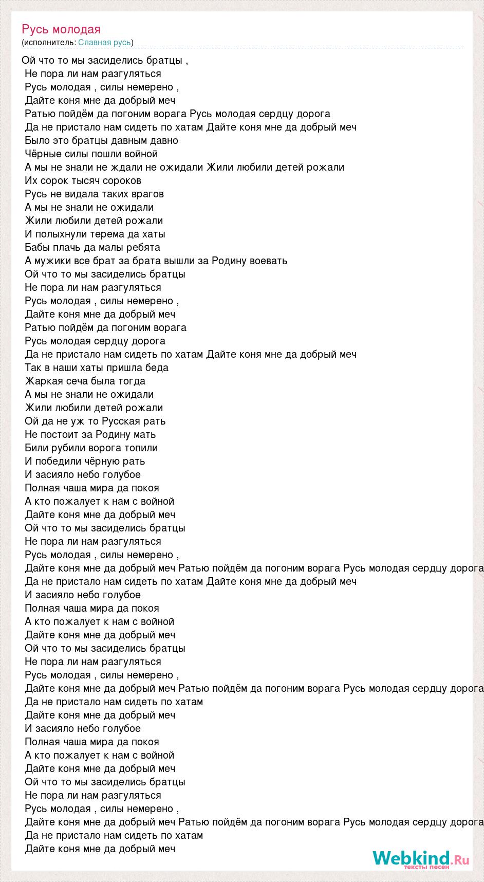 Ой что то мы засиделись братцы , Не пора ли нам разгуляться Русь молодая , силы немерено , Дайте коня мне да добрый меч Ратью пойдём да погоним ворага Русь молодая сердцу дорога Да не пристало нам сидеть по хатам Дайте коня мне да добрый меч Было это братцы давным давно Чёрные силы пошли войной А мы не знали не ждали не ожидали Жили любили детей рожали Их сорок тысяч сороков Русь не видала таких врагов А мы не знали не ожидали Жили любили детей рожали И полыхнули терема да хаты Бабы плачь да малы ребята А мужики все брат за брата вышли за Родину воевать Ой что то мы засиделись братцы Не пора ли нам разгуляться Русь молодая , силы немерено , Дайте коня мне да добрый меч Ратью пойдём да погоним ворага Русь молодая сердцу дорога Да не пристало нам сидеть по хатам Дайте коня мне да добрый меч Так в наши хаты пришла беда Жаркая сеча была тогда А мы не знали не ожидали Жили любили детей рожали Ой да не уж то Русская рать Не постоит за Родину мать Били рубили ворога топили И победили чёрную рать И засияло небо голубое Полная чаша мира да покоя А кто пожалует к нам с войной Дайте коня мне да добрый меч Ой что то мы засиделись братцы Не пора ли нам разгуляться Русь молодая , силы немерено , Дайте коня мне да добрый меч Ратью пойдём да погоним ворага Русь молодая сердцу дорога Да не пристало нам сидеть по хатам Дайте коня мне да добрый меч И засияло небо голубое Полная чаша мира да покоя А кто пожалует к нам с войной Дайте коня мне да добрый меч Ой что то мы засиделись братцы Не пора ли нам разгуляться Русь молодая , силы немерено , Дайте коня мне да добрый меч Ратью пойдём да погоним ворага Русь молодая сердцу дорога Да не пристало нам сидеть по хатам Дайте коня мне да добрый меч И засияло небо голубое Полная чаша мира да покоя А кто пожалует к нам с войной Дайте коня мне да добрый меч Ой что то мы засиделись братцы Не пора ли нам разгуляться Русь молодая , силы немерено , Дайте коня мне да добрый меч Ратью пойдём да погоним ворага Русь молодая сердцу дорога Да не пристало нам сидеть по хатам Дайте коня мне да добрый меч