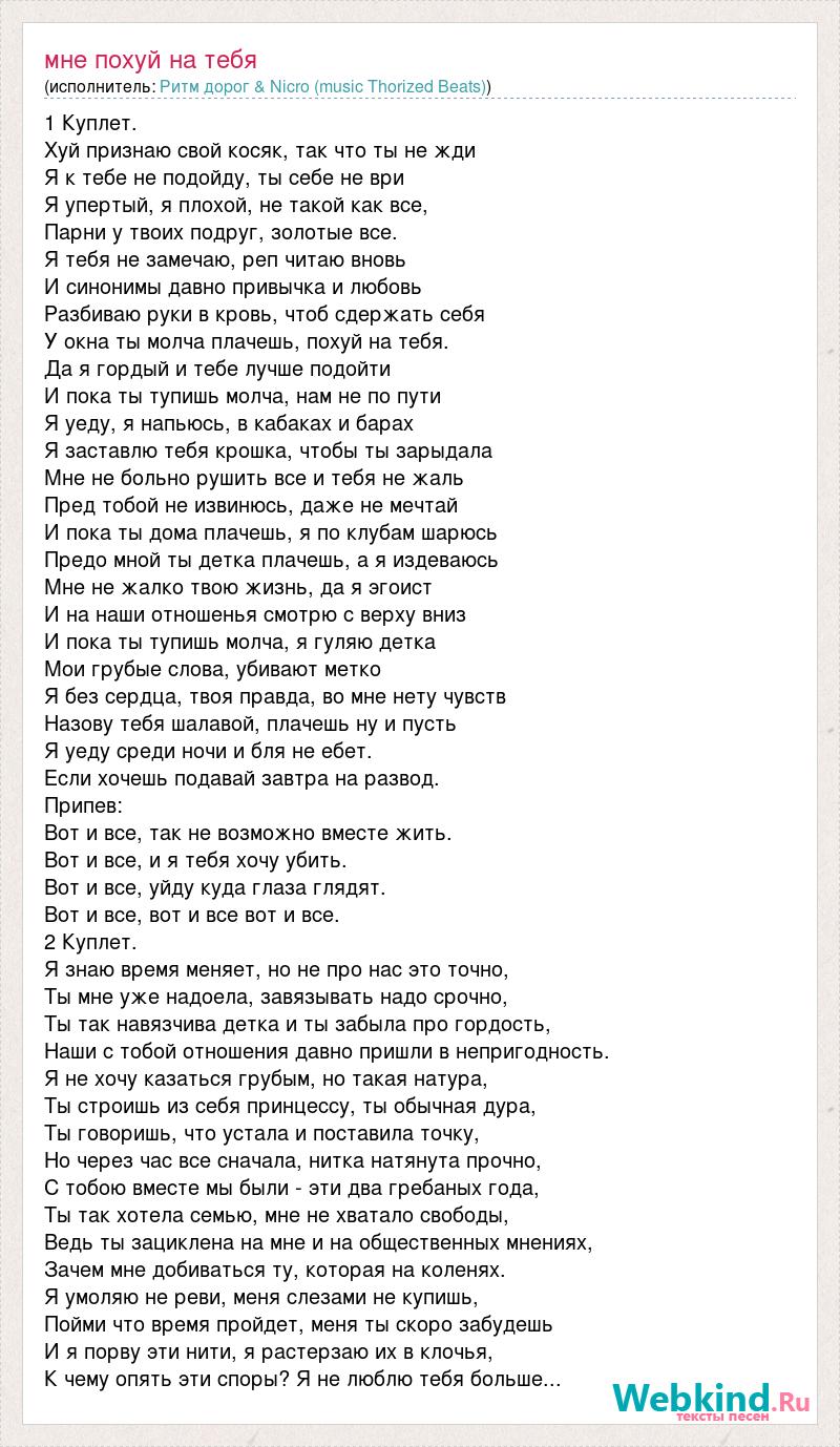 1 Куплет. Хуй признаю свой косяк, так что ты не жди Я к тебе не подойду, ты себе не ври Я упертый, я плохой, не такой как все, Парни у твоих подруг, золотые все. Я тебя не замечаю, реп читаю вновь И синонимы давно привычка и любовь Разбиваю руки в кровь, чтоб сдержать себя У окна ты молча плачешь, похуй на тебя. Да я гордый и тебе лучше подойти И пока ты тупишь молча, нам не по пути Я уеду, я напьюсь, в кабаках и барах Я заставлю тебя крошка, чтобы ты зарыдала Мне не больно рушить все и тебя не жаль Пред тобой не извинюсь, даже не мечтай И пока ты дома плачешь, я по клубам шарюсь Предо мной ты детка плачешь, а я издеваюсь Мне не жалко твою жизнь, да я эгоист И на наши отношенья смотрю с верху вниз И пока ты тупишь молча, я гуляю детка Мои грубые слова, убивают метко Я без сердца, твоя правда, во мне нету чувств Назову тебя шалавой, плачешь ну и пусть Я уеду среди ночи и бля не ебет. Если хочешь подавай завтра на развод. Припев: Вот и все, так не возможно вместе жить. Вот и все, и я тебя хочу убить. Вот и все, уйду куда глаза глядят. Вот и все, вот и все вот и все. 2 Куплет. Я знаю время меняет, но не про нас это точно, Ты мне уже надоела, завязывать надо срочно, Ты так навязчива детка и ты забыла про гордость, Наши с тобой отношения давно пришли в непригодность. Я не хочу казаться грубым, но такая натура, Ты строишь из себя принцессу, ты обычная дура, Ты говоришь, что устала и поставила точку, Но через час все сначала, нитка натянута прочно, С тобою вместе мы были - эти два гребаных года, Ты так хотела семью, мне не хватало свободы, Ведь ты зациклена на мне и на общественных мнениях, Зачем мне добиваться ту, которая на коленях. Я умоляю не реви, меня слезами не купишь, Пойми что время пройдет, меня ты скоро забудешь И я порву эти нити, я растерзаю их в клочья, К чему опять эти споры? Я не люблю тебя больше...
