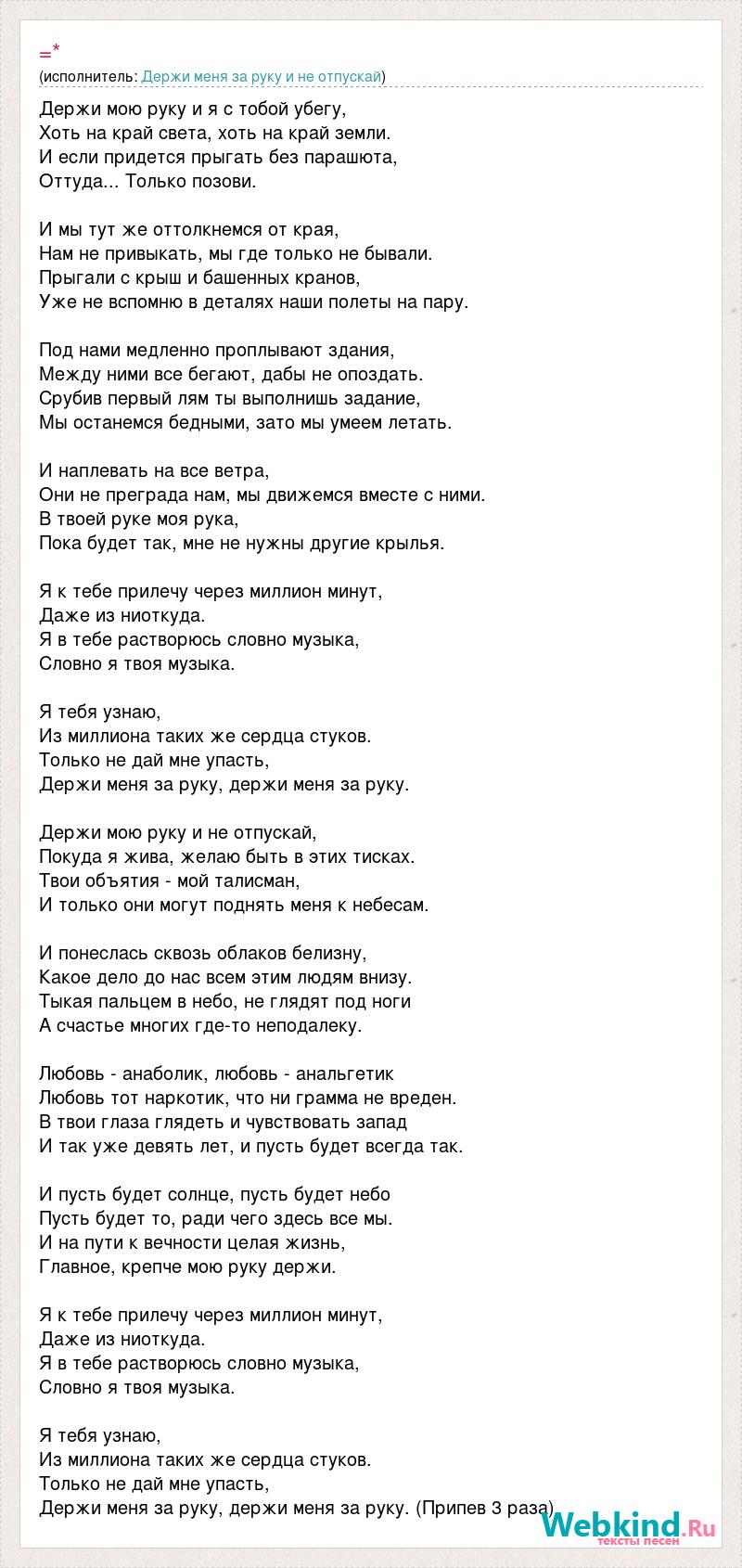 Держи мою руку и я с тобой убегу, Хоть на край света, хоть на край земли. И если придется прыгать без парашюта, Оттуда... Только позови. И мы тут же оттолкнемся от края, Нам не привыкать, мы где только не бывали. Прыгали с крыш и башенных кранов, Уже не вспомню в деталях наши полеты на пару. Под нами медленно проплывают здания, Между ними все бегают, дабы не опоздать. Срубив первый лям ты выполнишь задание, Мы останемся бедными, зато мы умеем летать. И наплевать на все ветра, Они не преграда нам, мы движемся вместе с ними. В твоей руке моя рука, Пока будет так, мне не нужны другие крылья. Я к тебе прилечу через миллион минут, Даже из ниоткуда. Я в тебе растворюсь словно музыка, Словно я твоя музыка. Я тебя узнаю, Из миллиона таких же сердца стуков. Только не дай мне упасть, Держи меня за руку, держи меня за руку. Держи мою руку и не отпускай, Покуда я жива, желаю быть в этих тисках. Твои объятия - мой талисман, И только они могут поднять меня к небесам. И понеслась сквозь облаков белизну, Какое дело до нас всем этим людям внизу. Тыкая пальцем в небо, не глядят под ноги А счастье многих где-то неподалеку. Любовь - анаболик, любовь - анальгетик Любовь тот наркотик, что ни грамма не вреден. В твои глаза глядеть и чувствовать запад И так уже девять лет, и пусть будет всегда так. И пусть будет солнце, пусть будет небо Пусть будет то, ради чего здесь все мы. И на пути к вечности целая жизнь, Главное, крепче мою руку держи. Я к тебе прилечу через миллион минут, Даже из ниоткуда. Я в тебе растворюсь словно музыка, Словно я твоя музыка. Я тебя узнаю, Из миллиона таких же сердца стуков. Только не дай мне упасть, Держи меня за руку, держи меня за руку. (Припев 3 раза)