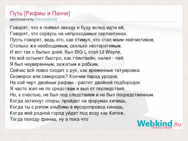 Говорят, что я поймал звезду и буду вслед идти ей, Говорят, что сорвусь на непроходимых серпантинах. Пусть говорят, ведь это, как стимул, что стал моим лейтмотивом, Столько же необходимым, сколько неотвратимым. И вот так с былых дней, был BIG L стал Lil Wayne, Но всё остынет быстро, как глинтвейн, налил - пей. Я был неуверенным, зажатым и робким, Сейчас всё ловко сходит с рук, как временные татуировки. Скоморох или самородок? Кончим парад уродов, На кой черт двойные рифмы - растет двойной подбородок Я часто жил не по средствам и выл от последствий, Но, к счастью, не был под следствием и не был посредственным. Когда затихнут споры, пройдет на форумах кипишь, Когда ты с рэпом альбомы в мусоропровод кинешь, Когда мой родной город уйдет под воду как Китеж, Тогда походу финиш, ну а пока что