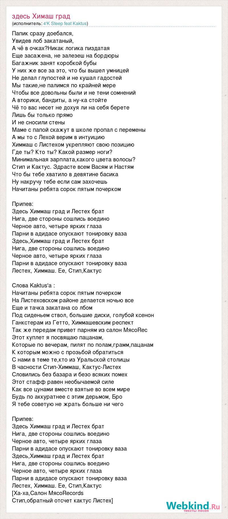 Папик сразу доебался, Увидев лоб закатаный, А чё в очках?Никак логика пиздатая Еще засажена, не залезеш на бордюры Багажник занят коробкой бубы У них же все за это, что бы вышел умницей Не делал глупостей и не кушал гадостей Мы такие,не палимся по крайней мере Чтобы все довольны были и не тени сомнений А вторики, бандиты, а ну-ка стойте Чё то вас несет не дохуя ли на себя берете Лишь бы только прямо И не сносили стены Маме с папой скажут в школе пропал с перемены А мы то с Лехой верим в интуицию Химмаш с Листехом укрепляют свою позицию Где ты? Кто ты? Какой размер ноги? Минимальная зарплата,какого цвета волосы? Стип и Кактус. Здрасте всем Васям и Настям Что бы тебе хватило в девятине басика Ну накручу тебе если сам захочешь Начитаны ребята сорок пятым почерком Припев: Здесь Химмаш град и Лестех брат Нига, две стороны сошлись воедино Черное авто, четыре ярких глаза Парни в адидасе опускают тонировку ваза Здесь,Химмаш град и Лестех брат Нига, две стороны сошлись воедино Черное авто, четыре ярких глаза Парни в адидасе опускают тонировку ваза Лестех, Химмаш. Ее, Стип,Кактус Слова Kaktus'a : Начитаны ребята сорок пятым почерком На Листеховском районе делается ночью все Еще и тачка закатана со лбом Под сиденьем ствол, большие диски, голубой ксенон Ганкстерам из Гетто, Химмашевским респект Так же передам привет парням из салон МясоRec Этот куплет я посвящаю пацанам, Которые по вечерам, пилят по полам,грамм,пацанам К которым можно с прозьбой обратиться С нами в теме те,кто из Уральской столицы В часности Стип-Химмаш, Кактус-Листех Словились без базара и безо всяких помех Этот стафф равен необычаемой силе Как все цунами вместе взятые во всем мире Будь по аккуратнее с этим дерьмом, Бро Я тебе советую не жрать больше ни чего Припев: Здесь Химмаш град и Лестех брат Нига, две стороны сошлись воедино Черное авто, четыре ярких глаза Парни в адидасе опускают тонировку ваза Здесь,Химмаш град и Лестех брат Нига, две стороны сошлись воедино Черное авто, четыре ярких глаза Парни в адидасе опускают тонировку ваза Лестех, Химмаш. Ее, Стип,Кактус [Ха-ха,Салон МясоRecords Стип,обратный отсчет кактус Листех]