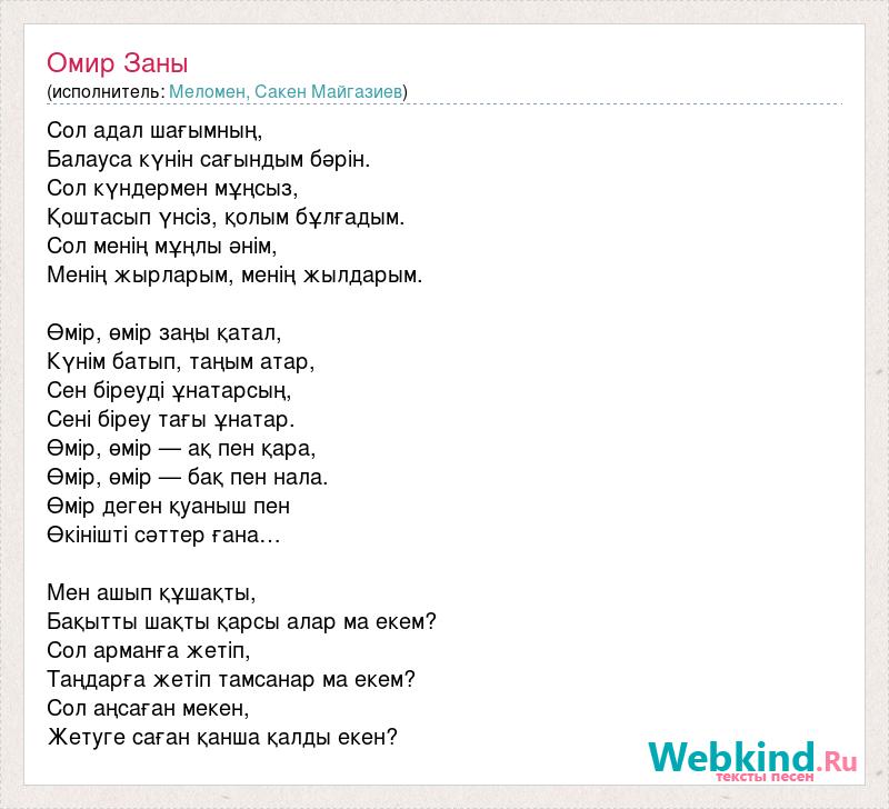 Сол адал шағымның, Балауса күнін сағындым бәрін. Сол күндермен мұңсыз, Қоштасып үнсіз, қолым бұлғадым. Сол менің мұңлы әнім, Менің жырларым, менің жылдарым. Өмір, өмір заңы қатал, Күнім батып, таңым атар, Сен біреуді ұнатарсың, Сені біреу тағы ұнатар. Өмір, өмір — ақ пен қара, Өмір, өмір — бақ пен нала. Өмір деген қуаныш пен Өкінішті сәттер ғана… Мен ашып құшақты, Бақытты шақты қарсы алар ма екем? Сол арманға жетіп, Таңдарға жетіп тамсанар ма екем? Сол аңсаған мекен, Жетуге саған қанша қалды екен?